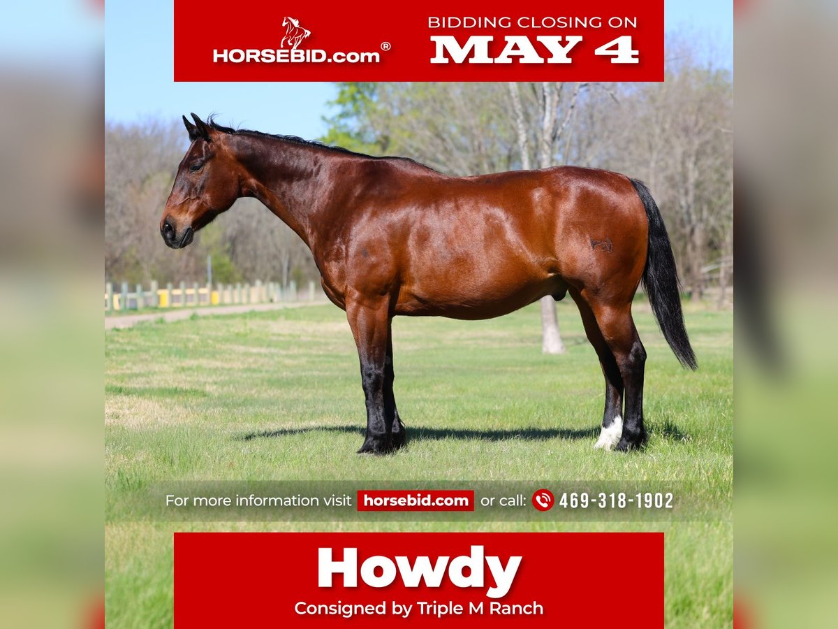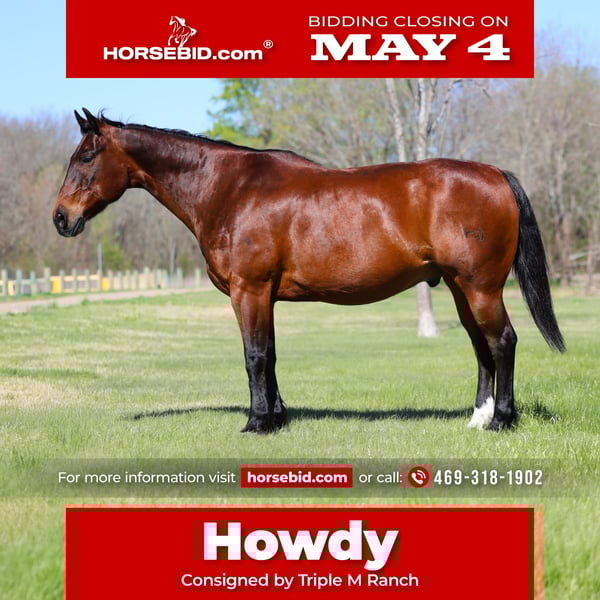 ▪️▫️◾️𝐭𝐡𝐞 𝑴𝒂𝒚 𝐒𝐞𝐥𝐞𝐜𝐭◾️▫️▪️ Happening now thru MONDAY | MAY 4th - Available EXCLUSIVELY on HorseBid's website! For more details and to register visit: www.Horsebid.com CONSIGNOR CONTACT: Triple M Ranch 469-318-1902 LOCATION: Talty, TX BREED: Quarter Horse REGISTERED: No COLOR: Bay HEIGHT: 15 AGE: 14 GENDER: Gelding This is Howdy. 🤠 If you are looking for a safe, reliable, and truly versatile gelding, look no further — Howdy is the one. He is a finished rope horse and all around using horse. He is broke, safe, all around gelding that stands 15 hands tall, is just 14 years old. He makes a statement of being all around horse for the whole family. He is gentle, quiet, and dependable in every way, he is the type of horse that is hard to come by and even harder to let go of. Whether you want to enjoy a relaxing trail ride or ride in the arena! He has the mindset to adapt to whatever you ask of him. Howdy has been roped off of a lot both in and out of the arena, and handles the job with ease and willingness. He has worked pens at the sale barn and his easy side pass makes him the perfect candidate for working and checking your cows out on the ranch! He’s soft and supple in the sides. Howdy is the same horse every time you saddle him. He rides off quietly, neck reins, and stays light in the bridle. He will walk, trot, and lope on a loose rein, and steps up willingly into a lope from a walk when asked without ever being hyper or hard to handle. Out on the trails, he is steady and sure-footed. He crosses water, handles rough terrain, and doesn’t spook at the unexpected. Whether you ride alone or in a group, Howdy stays calm, making him an ideal choice for anyone who values safety and confidence in their horse. He has the kind of mind and disposition that makes him suitable for any rider. Yes even first time riders. He is kind and forgiving for someone learning, yet broke and responsive enough for an experienced hand to enjoy. He is a standout gelding you can trust in any situation. It’s hard to find one this BROKE, and GENTLE! Howdy is UTD on shots, worming, and farrier work. He is 100% in every way. Pre evaluation was done by our vet (included in the pics). Absolutely ready to go to his new home. We can and will help arrange affordable shipping anywhere. Call with any questions. We would love to visit with you about Howdy. 🤠