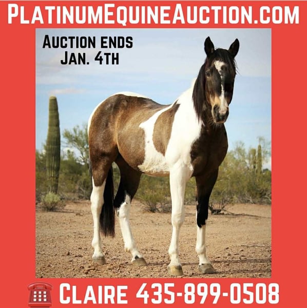 ONLINE AUCTION Place your bids at www.PlatinumEquineAuction.com Starting Bid $3500 Auction ends January 4th, 2025 Need a new saddle? Check out White Rock Saddles on our website or Facebook Flashy and sweet!! Mickey is a gorgeous 15 year old buckskin paint gelding standing a stout 15.3 hands tall wearing a size 1 shoe. Mickey is a finished head horse, he is good in the box, scores well, and knows his job when it’s time to rope. He has been hauled to jackpots and would also make a great practice horse at home. He neck reins, has a good stop, and is responsive and moves off your leg very well. He is more go than woah but doesn’t have a mean bone in him. Mickey has also been trail ridden and is happy to go out alone or with others. He’s been used on the ranch to push cattle and check fence. On the ground Mickey is a total love bug. He always has his head over his stall waiting for attention and love from his people. He stands tied, bathes, loads and hauls well. He gets along great with other horses and is even stalled next to our stallion here. Mickey would do best with a quiet and confident rider as he is responsive to your aids and not a dull type of horse. He is sound with no maintenance. Mickey does have a very mild sway back, but it does not affect his soundness or performance at all. This sweet boy is ready to be someone’s number one best friend! He is located in Marana, Arizona and we are happy to help arrange transport anywhere for him. Please feel free to call or text Claire Siebols with any questions about Mickey at 435-899-0508 ONLINE AUCTION Place your bids at www.PlatinumEquineAuction.com Starting Bid $3500 Auction ends January 4th, 2025 Need a new saddle? Check out White Rock Saddles on our website or Facebook