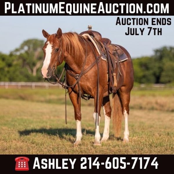 ONLINE AUCTION Place your bids at www.PlatinumEquineAuction.com Starting Bid $3500 Auction ends July 7th, 2024 Need a new saddle? Check out White Rock Saddles on our website or Facebook! “Lucy” – 14.2H, 13 year old grade sorrel quarter horse mare… Lucy is literally build like a brickhouse!!! They don’t get much stouter made then this mare – and she’s shapely made and absolutely striking with all four stocking legs and a blaze face! Lucy has been primarily pleasure and trail ridden the past 5 years with a senior rider. She is extremely laid back, gentle, and as uncomplicated to ride as they come – she is one you have to peddle a little at a trot and lope, and has way more “whoa” than she has go. This is the type of horse we get tons of calls about to just be a family pet, or turned out at a second home to enjoy on the occasional weekend. Lucy knows her job and is happy to go for a ride once a year or once a week, she is easy and pleasant to be around. She stands statue still extremely patiently for mount and dismount, even if you need a little extra time and are a little sloppy and uncoordinated getting on, Lucy contently stands there waiting for you to get settled before taking a step off. This mare is a breath of fresh air and very relaxing and easy to be around. Rides easily out alone and has been on many rides around the place, trail rides, or rides to town alone – she enjoys the time and is happy to go where-ever you want to go. Has a nice easy walk, trot, and lope on a loose rein, catches both of her leads easily and has a good quick stop on whoa. This would be a fun entry level local show horse, 4H horse, or a good mount to get your feet wet at the local stock horse or ranch horse shows. Super easy keeper – looks like this coming straight out of living outside with the cows! She is also happy inside, loves the attention and loves being spoiled and kept in the barn. Happy turned out with others, lives with a small group of mixed horses now. Always the first up to you sticking her head in the feed bucket or the halter – very sweet and overly friendly. Good ground manners, easy to bridle, saddle, groom, stands dead quiet and patiently for mount and dismount, bathe, load in the wash racks, hops right on the trailer, and stands patiently. Lucy was just shod this past week and is wearing front shoes, her teeth were also done by an equine dentist last month, she has had her ears treated for ticks, and she was also power packed wormed. She is also good to shoe all around, and has great feet and goes very well barefoot – if her new owner prefers her to be fully show, or to be barefoot – we can have either done prior to her heading to her new home. She will arrive at her new home up-to-date and ready to go to work! We are experienced, knowledgeable sellers, and we can help with quickly arranging affordable shipping to any buyer’s location – we have experience shipping worldwide – including regularly to Hawaii, Canada, Mexico, Europe, and South Africa. Call Ashley at 214-605-7174 GO TO BusterHorses DOT com for more videos! ONLINE AUCTION Place your bids at www.PlatinumEquineAuction.com Starting Bid $3500 Auction ends July 7th, 2024 Need a new saddle? Check out White Rock Saddles on our website or Facebook!