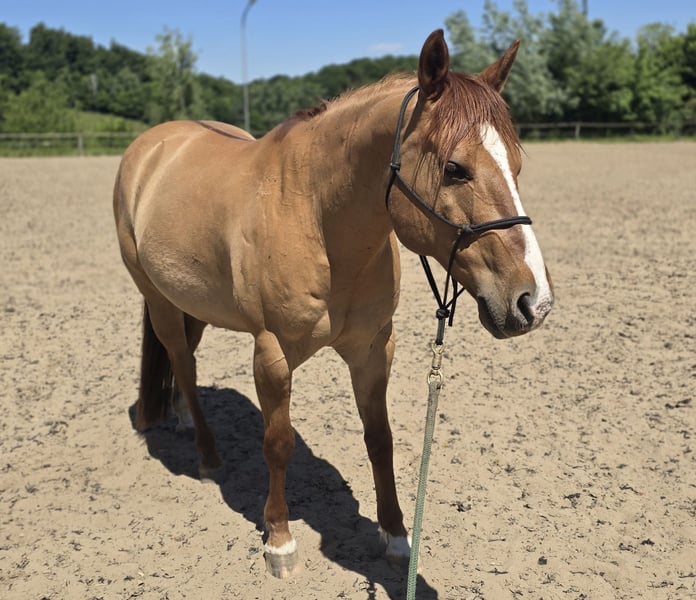 I am looking for a new, loving home for my Quarter Horse gelding, "Yankee." This is not an urgent sale, and he is not being sold as a school horse. It is important to me that Yankee finds his new home with experienced and gentle hands. Profile: * Name: Yankee * Breed: Quarter Horse * Gender: Gelding * Age: 14 years * Height: approximately 14.9 hh * Papers: available, registered with the American Quarter Horse Association (AQHA) * Training: Western, Reining * Health: healthy and robust, well-maintained hooves, occasional coughs in winter * Tack: available upon request * Location: near Darmstadt, Hesse About Yankee: Yankee is a sensitive, gentle gelding with solid reining training. Over the past five years, I have mostly ridden him in the field. He is very light to ride, enjoys groundwork, liberty work, and spending quality time with his handler. Those who take the time to get to know him will find a true heart horse that aims to please and impresses with his refined nature. In the arena, he works patiently and is eager to learn new things, often showing playful antics. He is not a beginner’s horse but requires an experienced, calm, and clear handler who can provide him with security, as he also has a sensitive side. In the field, Yankee behaves well in the company of another horse. I do not recommend riding him alone, as he tends to be more reactive when he perceives everything around him. Important: * Only serious inquiries, please. * A trial ride costs €50, which will be deducted from the purchase price if you decide to buy. Price: €7,500 negotiable If you feel addressed and are looking for a (second) horse to have fun with, learn from, and share a journey, I look forward to hearing from you.