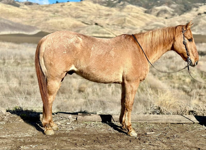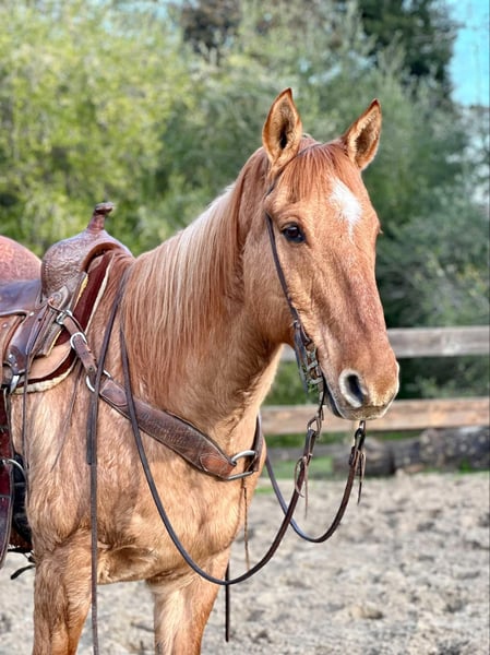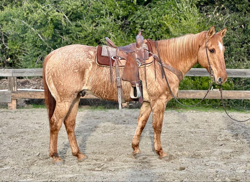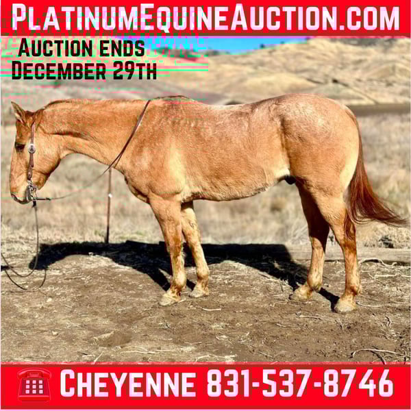 ONLINE AUCTION Place your bids at www.PlatinumEquineAuction.com Starting Bid $3500 Auction ends December 29th, 2024 Need a new saddle? Check out White Rock Saddles on our website or Facebook! Cujo is a beautiful roan red dun, come spring when he sheds his winter coat, he will be one of the prettiest colors you’ll ever see! Cujo is 13 years old and stands firm 15HH. If you’re looking for a fun enjoyable ride every time, you’re sure to love him! Cujo is just about as easy going as they come, gentle as the day is long and will be transitional enough for all level of riders. Previously, Cujo was a low level jumper for the kiddos and he has won many competitions with beginners to intermediate English riders. I am obviously no English rider, but I have jumped him in a western saddle and WOW! Currently he has been our go to trail steed and has been rode all over the forests, beaches and trail California has to offer. He is happy anywhere in the herd, will cross anything you point him at and is a worry free, no spook, type of guy! He has a flashy movement and always carries himself collected, low headed and correct. He walk-trot-lopes the prettiest circles, has a good sliding stop and pivots shoulders and hind quarters at the soft touch of a foot. He will easily side pass, do flying lead changes, and back up effortlessly. He has also been around the ranch and is familiar is cattle, as well as other farm animals. You can open gates from his back, and do anything else you please. Cujo is laid back and never gets fresh or sour. You can carry flags, tarps and anything else you want on his back. This pretty guy will suit anyone from the weekend warrior trail rider, a kiddos wanting to get into that show ring, or a family home looking for a sweet boy to love on! No matter the home, we are sure you’re going to love every minute with Cujo! He is located in Bitterwater, CA. For more information or to come see him in person please contact Cheyenne Rey 831-537-8746. ONLINE AUCTION Place your bids at www.PlatinumEquineAuction.com Starting Bid $3500 Auction ends December 29th, 2024 Need a new saddle? Check out White Rock Saddles on our website or Facebook!
