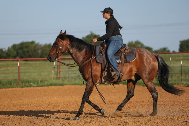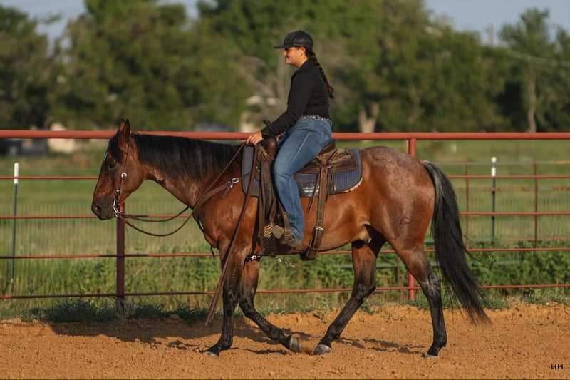 ONLINE AUCTION Place your bids at www.PlatinumEquineAuction.com Starting Bid $3500 Auction ends August 25th, 2024 Need a new saddle? Check out White Rock Saddles on our website or Facebook! Dancers Gentleman Aka “Brik” is a 2011 model Registered Quarter Horse gelding. Standing at 15 HH, Brik is a stunning Bay Roan color that will surely get you noticed. Brik is extremely broke and gentle making him an excellent horse for everyone in the family to enjoy. This gelding has truly amazed me with how much he is willing to do even if he wasn’t sure how or what to do. Brik was used as a ranch horse most of his life and has seen many miles under the saddle. He is a “been there done that” type of horse. Brik w/t/l very nicely on a loose rein both directions and all of his gaits are extremely smooth and easy to sit. He is a “more whoa than go” type of gelding which is one of the qualities that makes him suitable for almost any level of rider. He has a very nice stop from all gaits and has a smooth turn around both directions. He is excellent in big open pastures, trails, or in town. He was excellent with traffic in town and didn’t think twice about anything I asked of him. I’ve used Brik to gather calves and brought him through water crossings, there truly aren’t many things I haven’t tried with this gelding! He was absolutely incredible in the arena for me when I took off his bridle. Not very many horses stay almost completely trained when I take the bridle off in my large arena but Brik acted as if nothing had changed. This gelding is broke enough for advanced riders to have a ton of fun on like I myself have had, but he’s smooth, slow, and gentle enough that intermediate and beginner riders will also love him! Brik isn’t just excellent under saddle but on the ground as well. He stands tied nicely at the barn or the trailer to be groomed, saddled, and bathed. I’ve learned he loves baths and usually plays with the water when I give him a chance. He stands nicely to have his feet picked or shod by the farrier. Brik will load on the trailer with ease, he will follow you on or will send on as well as back off on his own. Brik gets along very well with other horses and usually sits lower in the herd. He has recently been seen by my farrier, dentist, and chiropractor and is up to date on those cares. Brik is a remarkable gelding and one I have come to love and call one of my favorites. He is going to be an excellent addition to anyone’s barn as he has been for my own. For more questions and information please reach out, to Sydney with SRS Training and Sales 518-935-8282. He is located in Granbury, TX. I absolutely love talking about this handsome gelding and could go on all day long! ONLINE AUCTION Place your bids at www.PlatinumEquineAuction.com Starting Bid $3500 Auction ends August 25th, 2024 Need a new saddle? Check out White Rock Saddles on our website or Facebook!