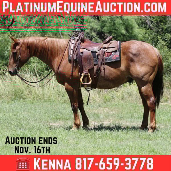 ONLINE AUCTION Place your bids at www.PlatinumEquineAuction.com Starting Bid $3500 Auction ends November 16th, 2025 Need a new saddle? Check out White Rock Saddles on our website or Facebook Before you scroll past because he’s just a plain red roan, see if he checks these few boxes for you?⬇️ ◻️An absolutely Bombproof, gentle kind soul for any age from 3-93? 🔳 A horse that is handy enough but calm enough to do any job or anything you ask of him? 🔲The ultimate kids horse that they can have hours of fun with? ◻️A finished rope horse that is perfect for someone wanting to learn or just someone wanting to rope on the weekends? 🔳The perfect gelding to ride down the trails all day long without any trouble whatsoever? 🔲A great lesson horse? Or Drill team? Maybe a sorter? To go ranch on? Paco may be just a plain roan horse, some people won’t even look his direction because he’s not flashy colored. 90% of the people looking for a horse right now, are in fact looking for something exactly like him. Paco is GRADE 14 years old, a perfect age, 15hh tall, the perfect height! He is put together correctly and if he even checks one of the boxes mentioned for you, I encourage you to please check him out! He is a very gentle horse and on a scale of 1 to 10, he’s a -2 on quietness, gentleness and temperament. He is one of those all around geldings that are forgiving enough for those complete beginner riders but he is also fun for an advanced! You can’t go wrong with him for your family! Paco is very easy, he walks, trots, lopes and side passes very well! He’s been used at countless rodeos as a pickup horse and a head horse! We can’t say enough good things about him, and believe it or not, there is NOT one bad thing we could say. He is a finished head horse, established ranch horse, the very best trail horse and the perfect addition to your family. I could talk about him all day long, or you could come see him for yourself! We are located in Lipan Texas but have reputable haulers that go all over the country, including Hawaii and Canada. Give me a call or text and I’d be happy to answer any questions Makenna Hartzell 817-659-3778 ONLINE AUCTION Place your bids at www.PlatinumEquineAuction.com Starting Bid $3500 Auction ends November 16th, 2025 Need a new saddle? Check out White Rock Saddles on our website or Facebook