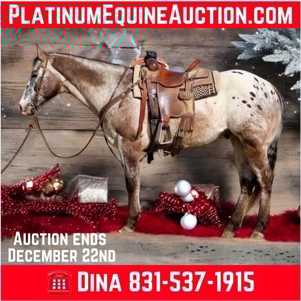 NLINE AUCTION Place your bids at www.PlatinumEquineAuction.com Starting Bid $3500 Auction ends December 22nd, 2024 Need a new saddle? Check out White Rock Saddles on our website or Facebook! Have you been tirelessly searching for that perfectly reliable horse, just in time for Christmas one who embodies the phrase “been there, done that,” and can be trusted time and again to keep your loved ones safe? Look no further than Beetlejuice! This stunning traditional Appaloosa is a 13-year-old, gentle gelding stands a solid 15 hands tall and he’s an exceptional partner ready to embark on countless adventures with you. His calm demeanor makes him ideal for young riders; he’s the type of horse on which parents feel comfortable turning their kids loose on. Whether it’s navigating through water crossings, walking over bridges, or conquering logs in the great outdoors, Beetlejuice handles it all with phenomenal surefootedness. He’ll follow any trail you take him down alone or with friends and has effortlessly mastered obstacles like tires and walkovers. In the arena, he shines bright: picking up leads with grace, stopping beautifully on cue, and backing up smoothly all while being as patient as they come. Traffic? No problem! Cars whizzing by or trains chattering along won’t faze this magnificent boy at all; he’s truly trustworthy in every situation imaginable. With his laid-back personality and array of cool buttons he is a cruiser type horse. Beetlejuice is also an excellent ranch horse ready to help out with everything from branding to sorting cattle. Easy-going doesn’t even begin to describe him; he loads into any trailer effortlessly and greets each grooming session with ease. He is great for the farrier and vet and is up to date on worming and vaccinations. He tacks up easy and hauls anywhere. Handles time off well. Shipping is available anywhere. Please contact Longhorn Ranch Dina 831-537-1915 located in Paicines, CA we look forward to speaking with you regarding this amazing boy.ONLINE AUCTION Place your bids at www.PlatinumEquineAuction.com Starting Bid $3500 Auction ends December 22nd, 2024 Need a new saddle? Check out White Rock Saddles on our website or Facebook!