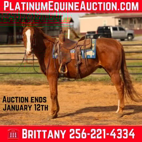 ONLINE AUCTION Place your bids at www.PlatinumEquineAuction.com Starting Bid $3500 Auction ends January 12th, 2024 Need a new saddle? Check out White Rock Saddles on our website or Facebook! Jag is 15 years old 14.3 hands tall he is a finished ranch gelding handy as the pocket on your shirt at any job that might need done on the ranch you can rope and doctor on him gather cattle sort cattle or throw the little ones or the beginner riders on him to enjoy a ride he may not be the prettiest but he will sure be the most honest with no silly business if you are looking for a beginner child safe gelding check him out also traffic safe and great to trail ride 100 percent solid gelding. Located in Mt. Hope, AL. Contact Brittany Little 256-221-4334. ONLINE AUCTION Place your bids at www.PlatinumEquineAuction.com Starting Bid $3500 Auction ends January 12th, 2024 Need a new saddle? Check out White Rock Saddles on our website or Facebook!