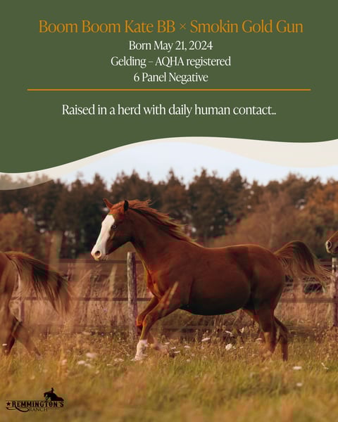 View the photos to discover the story of “Smokey” – Be Aech Smoking Gun. Born May 21, 2024 – Gelding – AQHA registered – 6 Panel Clean A young powerhouse with a calm presence and a heart of pure honesty. Strong, steady, and so well balanced you trust him instantly. For the rider who leads with feel, he’ll be a true partner. Raised in a natural herd with calm, space, and daily human connection. 📍 Remmington’s Ranch – Arendonk (BE) www.remmingtonsranch.be -------------------------------------------------------------------------- Bekijk in de foto’s het verhaal van “Smokey” Be Aech Smoking Gun. Geboren 21 mei 2024 – Ruin – AQHA ingeschreven – 6 panel clean Een jonge krachtpatser met een kalme uitstraling en een goudeerlijk karakter. Sterk, stabiel en zó in balans dat je hem meteen vertrouwt. De ruiter die met gevoel rijdt, vindt in hem een echte maat. Opgegroeid in kuddeverband met rust, ruimte en dagelijks contact met de mens. 📍 Remmington’s Ranch – Arendonk (BE) www.remmingtonsranch.be Bekijk ook onze andere advertenties. Momenteel zijn er 3 jaarlingen klaar voor hun nieuwe huis.