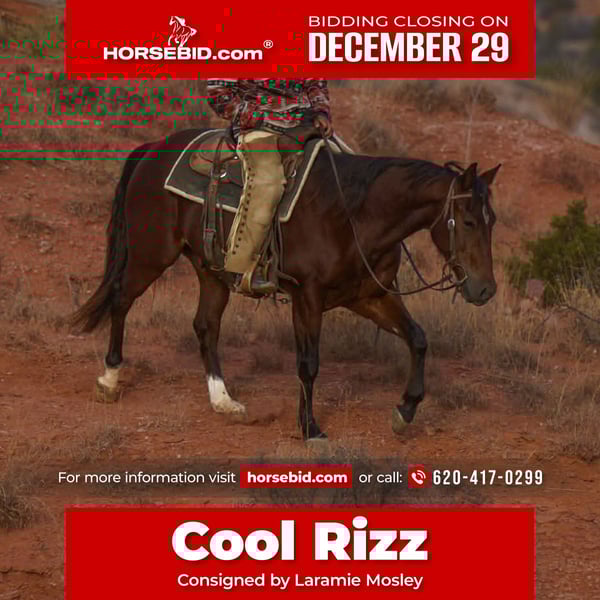 ⚜️ 𝓗𝓮𝓻𝓲𝓽𝓪𝓰𝓮 𝐖𝐢𝐧𝐭𝐞𝐫 𝓒𝓵𝓪𝓼𝓼𝓲𝓬⚜️ Happening now thru MONDAY | DECEMBER 29th - Available EXCLUSIVELY on HorseBid's website! For more details and to register visit: www.Horsebid.com CONSIGNOR CONTACT: Laramie Mosley 620-417-0299 LOCATION: Canyon, TX BREED: Quarter REGISTERED: Yes REGISTERED NAME: Cool Rizz COLOR: Bay HEIGHT: . AGE: 2 GENDER: Gelding This outstanding young colt is big, handsome, and talented, with a mind far beyond his years. He is quiet, sensible, and easy to be around—so good minded you’d never guess how young he truly is. He has real-world experience outside the arena paired with an exceptional start inside it. He has a lot of feel and natural ability, and is the kind of horse that could go in so many different directions. Under saddle, he shows fancy spins with big reach, a deep, correct stop, and cute, balanced circles. He is an easy, beautiful mover with natural cadence and feel. This colt will work the flag and has come out of a solid cow horse program, giving him a strong, correct foundation. Outside the arena, he has had cattle doctored on him and has been used to sort and ship. He would make into a rope horse overnight, or you could easily finish him out in the cow horse or shot events. He is sired by Cool N Hot, an earner of over $460,000 LTE, and out of a daughter of Cats Red Feather, an $8,300 earner, giving him both the pedigree and performance genetics to match his ability. He is also eligible for the Gold Buckle Futurities, adding even more value and opportunity for the future. This is a young horse that truly offers the best of both worlds—real ranch experience and polished arena training, combined with looks, talent, pedigree, and an exceptional brain that sets him up for a very bright future in any direction you choose.
