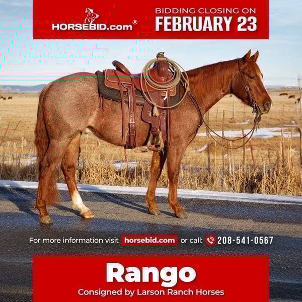 💎 𝐓𝐇𝐄 𝓓𝓲𝓪𝓶𝓸𝓷𝓭 𝐒𝐇𝐎𝐖𝐂𝐀𝐒𝐄 💎 Happening now thru MONDAY | FEBRUARY 23rd - Available EXCLUSIVELY on HorseBid's website! For more details and to register visit: www.Horsebid.com CONSIGNOR CONTACT: Larson Ranch Horses 208-541-0567 LOCATION: St. Anthony, ID BREED: AQHA REGISTERED: Yes REGISTERED NAME: DF DOCS METALLIC OLENA COLOR: Red Roan HEIGHT: 14 AGE: 3 GENDER: Gelding Comes with Clean and Current PPE. Meet Rango! The kind everyone hopes to find. He is an exceptional red roan gelding with the pedigree and mind that would fulfill any riders’ dreams. He has the looks, build, and disposition that one can only hope to find in a partner and friend. Rango always wants to be your best friend, and is a sucker for love and attention. He is thick and American made. With a stout build at 14hh. Rango is quiet to be around, and a gentleman on the ground. He’s been exposed to almost anything you can imagine including whips, tarps, flags, pool noodles, bags, ropes, or whatever else might look strange to a horse. Beyond being quiet, Rango is really soft in the face and throughout his body, and is a super pretty mover in the arena. The softness throughout his body makes him a great candidate to go on to compete at the next level. He wants to ride slow, and relaxed. Rango rides with his head low, collects up nicely, and stops on a loose rein. He has a beautiful turnaround, and handles quietly and on balance. He picks up both leads nicely and lopes off with ease. Rango has all the buttons to making him user friendly, and is forgiving of mistakes. He’s no stranger to work and has been used in different ranch capacities that include roping, doctoring, gathering, working gates, shipping cows, etc.. Rango has also been started out of the box tracking the smarty. He knows how to handle himself in different environments, and situations. Rango also really shines, and excels being out on the trails. He’s calm, steady, and quiet while handling himself in rough country. Maneuvering with ease over bridges, bogs, crossing water, etc… Rango has been ridden by different levels of riders, and handles new situations with ease. We believe he would really go far in trail versatility classes, or as a roping or ranch prospect. His potential and possibilities are never ending. Whether you’re on the ranch, in the arena, up in the mountains, or carrying our nations flag proud, everyone notices him for his looks, and quiet demeanor. Rango is the best, and favorite in the barn. We couldn’t be more privileged and proud to offer him. For more information, Text or Call (208)541-0567.