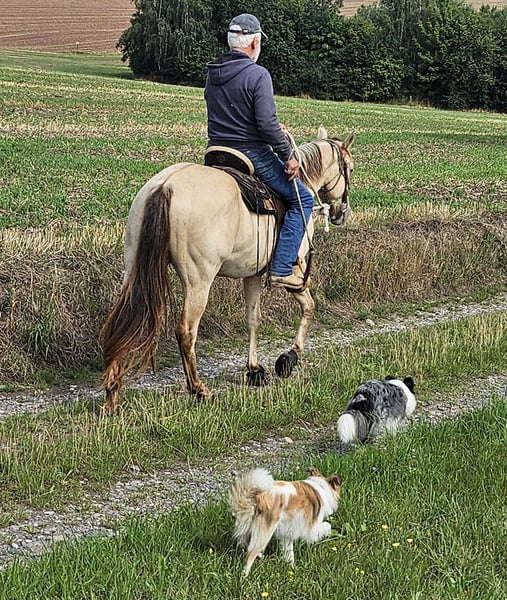Zeb King Maxen - ein bildhübscher Quarter Horse Wallach, geboren am 2. Mai 2022. Mit seiner seltenen und außergewöhnlichen Farbe Amber Champagne Dun zieht er alle Blicke auf sich. Er wird ein geschätztes Endmaß von ca. 148 cm erreichen und ist kompakt, korrekt gebaut und stabil - mit vielversprechenden Proportionen, die ihn zu einem echten Allroundtalent machen. Zeb ist gesund, genetisch 6-Panel n/n über die Eltern und selbstverständlich altersgemäß geimpft und entwurmt. Er wächst in einer gemischten Herde im Offenstall auf, wo er unter besten Bedingungen viel Ruhe und Sicherheit erfahren durfte. Sein Charakter ist ebenso überzeugend wie sein Exterieur. Der Wallach zeigt sich menschenbezogen, neugierig, nervenstark und entspannt. Gleichzeitig ist er aufmerksam, lernwillig und mutig gegenüber neuen Aufgaben. Zeb ist artig, unkompliziert im Umgang, gut erzogen und lernt schnell - beste Voraussetzungen für eine zuverlässige Partnerschaft auf lange Sicht. Derzeit wird er behutsam und mit viel Gefühl nach den Grundsätzen des Natural Horsemanship auf sein Leben als Reitpferd vorbereitet. Er ist angeritten und zeigt sich dabei sehr brav und gelassen, auch im Gelände. Mit seiner guten Abstammung, seinem tollen Interieur und seiner Vielseitigkeit eignet sich Zeb ideal für Freizeit, Sport oder Turnier. Er ist ein echtes Nachwuchspferd mit Zukunft - ein treuer Partner, auf den man sich verlassen kann.