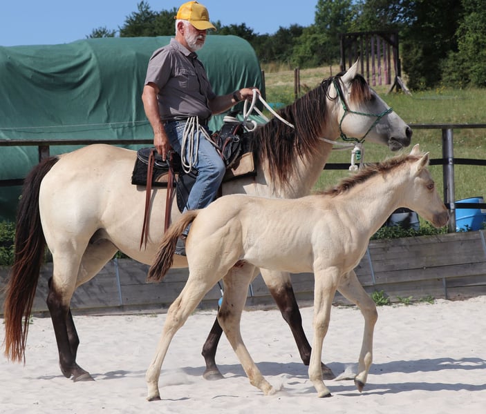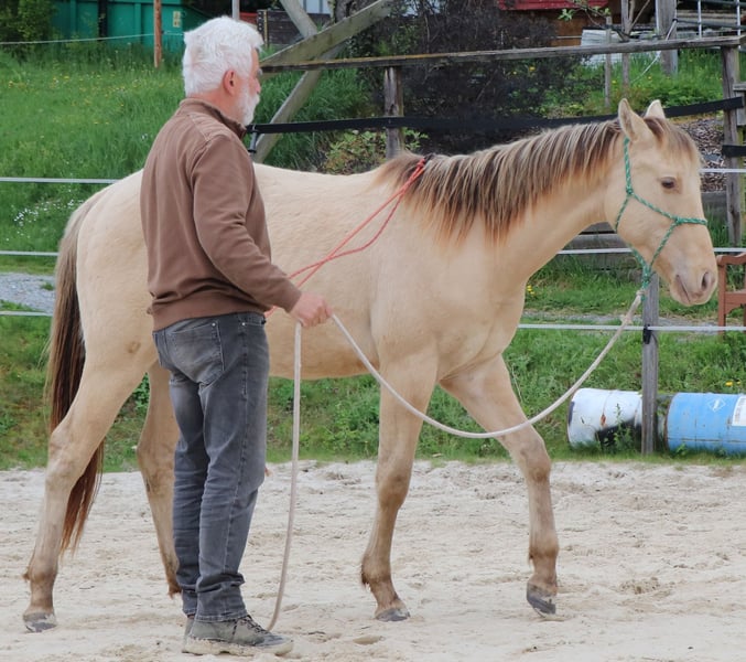 Ivo is an expressive young stallion who has been curious since day one. It will become a very reliable partner for life for the ambitious recreational or tournament rider. He is carefully prepared by us for his future life with the methods of Natural Horsemanship. He enjoys his life in open stables on a large pasture in a mixed herd. On our page http://pferdezucht-maxen.de/Ivo-Dunit-Maxen/ under the button "Training protocol" you will find the current training status.