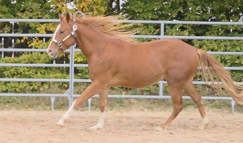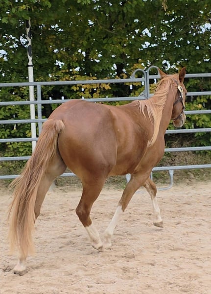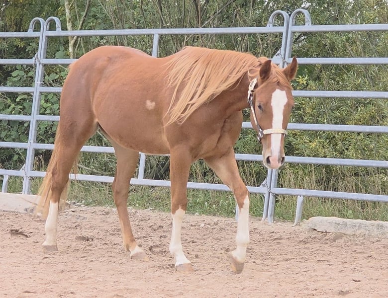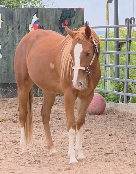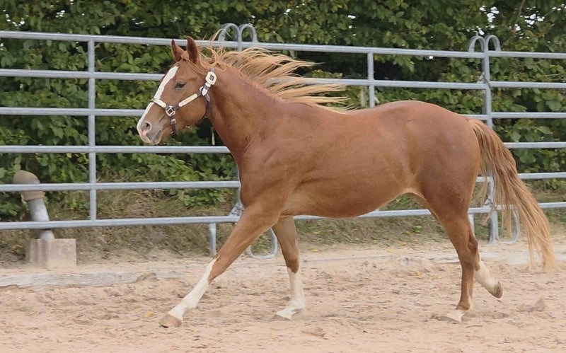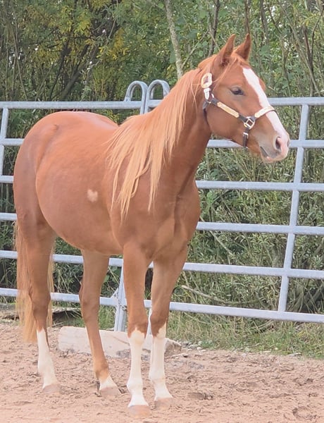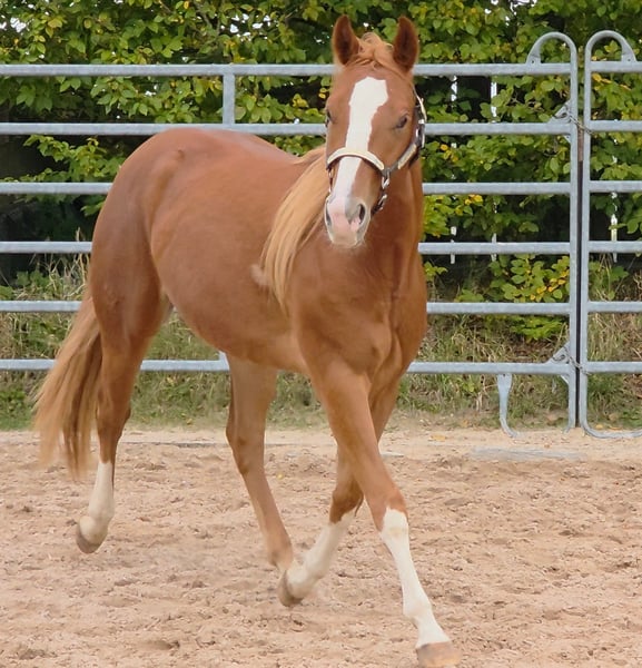 HES A RUF SHINER aka "Arkadi" Born on March 24, 2023, this small chestnut stallion is a promising young prospect. Like his half-brothers, he has a slightly flat mane and tail and carries the Rabicano gene in the form of a small heart on his right side — truly extraordinary. His sire, One Shiney Treat, is a direct son of Shining Spark (Sire: Shining Spark, $10.6 million in progeny earnings). His dam, Hagandaz, has LTE of $49,289 in NCHA and NRCHA, with OE of $65,616 in NRHA, NCHA, and NRCHA (Grays Starlight x Doc O Lena). His dam’s dam, Sailin Jumping Joana, is a daughter of Sailin Ruf — LiL RUF PEPPY, a $3 million sire, Hall of Fame member in AQHA & NCHA (2008), from a somewhat lesser-known maternal line tracing back to DOC LYNX (NCHA LTE: $4,716,808.10). ⭐️ 6-panel test: N/N His half-brothers from Smartest Little Cat were outstanding and received 1A ratings from the DQHA as foals, with scores between 80.41 and 85.34, which speaks volumes about the quality of his lineage and the offspring of this exceptional Shining Spark son. Arkadi has a confident, spirited personality. Curious, temperamental, and self-assured, he already demonstrates impressive movement potential — quick, balanced, with a strong, correct foundation, and very harmoniously muscled. Based on his current growth, we estimate he will be over 150 cm, likely around 153 cm. He is growing up in our colt group here at Hof Eichelbrunn. He shows a very confident demeanor but also respects the guidance of the older horses. During a recent evaluation, the offspring of One Shiney Treat impressed everyone, receiving top scores between 80.41 and 85.34, highlighting the excellent quality of this promising Shining Spark progeny. He can be transferred at any time with papers, COR, and a German DQHA equine passport. Like all our young horses, he is vaccinated against tetanus and regularly hoof-trimmed. He is enrolled in the DQHA Futurity. A very promising young horse for ambitious sport and leisure riders! Since March 24, 2025, Arkadi has been a happy gelding. And of course, he’s excited to pack his things and face new challenges. Visits are possible at any time by arrangement.