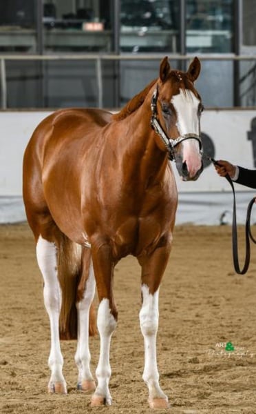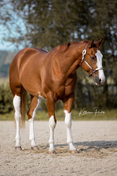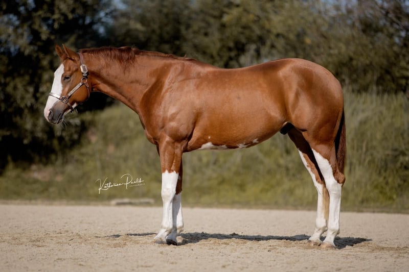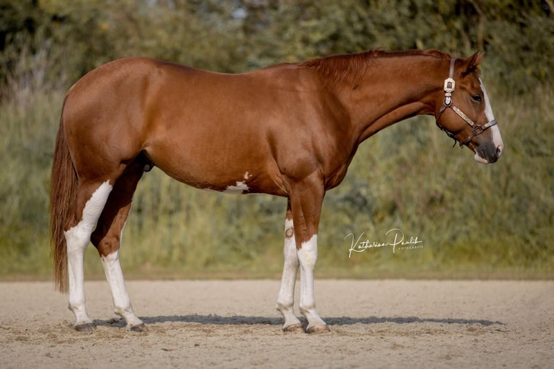 SQ Cool Crackajack alias Cooper est un hongre Quarter/Paint de 3 ans, inscrit à la fois dans les registres Quarter et Paint, élevé par Monika Hagen - Stossberg Quality Horses. Il a obtenu une note globale de 8,0 lors du foal show. Cooper est arrivé chez moi en tant que poulain sevré et a grandi en paddock collectif avec ses congénères. Nous avons régulièrement effectué des sorties et des promenades avec lui, ce qui lui a permis d’être insensible à l’environnement. Voitures, tracteurs, etc., ne le perturbent pas. Il porte bien son nom, car il est vraiment cool. Qu’il soit seul ou en groupe, il reste toujours parfaitement lucide et intrépide. Il a grandi avec mes enfants et mes chiens. Le maréchal-ferrant et le van ne posent aucun problème. Il est habitué à sortir tous les jours à la pâture, toute l’année. À 2 ans, il a été présenté dans 3 shows et a toujours réussi à se placer dans toutes les épreuves mentionnées. - 2x APHA Grand Champion des étalons en main, - 1x APHA Vice-Champion des étalons en main, - 2e place en Trail en main à l’APHA, - BayernPaint : - Vainqueur Junior Stallions en main Amateur et Open, - 4e place en Trail en main pour 2 ans, - 5e place en Trail en main toutes catégories, - Germain Paint Championship Kreuth : - 3e place en étalons amateurs, - 4e place en étalons amateurs yearlings et de 2 ans. Nous avons utilisé ces concours pour lui permettre d’acquérir de l’expérience et de rester cool pour ses futures compétitions. Il est actuellement chez Lena Felder à Moosthenning, en pension professionnelle, où il a bénéficié d’une solide formation de base. Les manœuvres de reining lui sont familières. Avec sa taille de 1,59 m et sa silhouette athlétique, il peut sans problème convenir à de grands cavaliers et serait également adapté pour l’all-around ou le ranch rail. Des radiographies datant de l’automne 2024 sont disponibles, sans anomalie. Je peux envoyer d’autres infos, photos et vidéos sur demande. Inscrit pour l’année (SSSP 2021) au PHCG ainsi qu’au SSA 2021 auprès de la DQHA. À 2 ans, inscrit au programme de jeunes chevaux de l’EWU.
