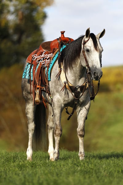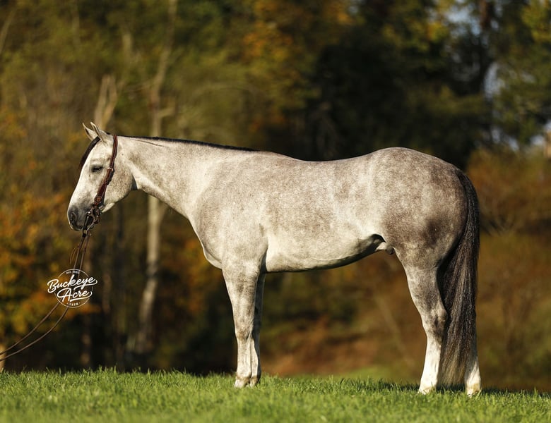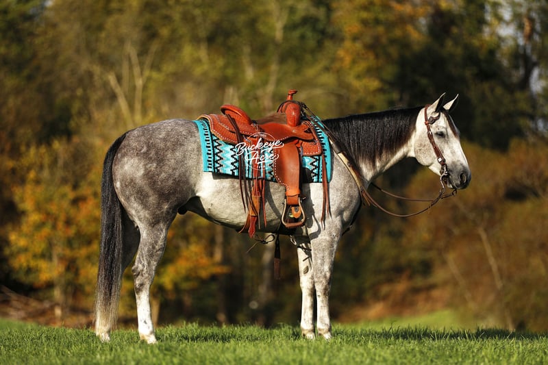 If you are looking for that once-in-a-lifetime kind of partner, the one that makes you smile the moment you see him—meet Grayson. This beautiful 2021 model AQHA gelding stands 14.3 hands tall and wears a stunning dappled gray coat that shimmers in the sunlight. With two white hind socks climbing up to his knees, a kind expression, and balanced conformation, Grayson turns heads everywhere he goes. Versatile, kind, and steady, Grayson is the kind of horse anyone can enjoy—kids, seniors, or advanced riders alike. Whether you are dreaming of showing him one day, heading out on the trails, or just having a trustworthy partner for family rides, Grayson is ready to be your next best friend and adventure buddy. It is not just his looks that make him special is his heart. Grayson is the first to meet you at the gate, ears forward, ready for scratches and attention. He loves people and has that true “want to please” personality that makes every ride a joy. He is quiet and easy to manage in the barn, stands like a gentleman for grooming and tacking, and genuinely enjoys being with his person. Grayson has been on countless trail miles, confidently crossing creeks, stepping over logs, and going up and down hills without a fuss. He has been ridden on state roads through traffic and takes everything in stride. He is just as comfortable in the indoor or outdoor arena, staying calm and consistent wherever you take him. He has been ridden Western, English, and bareback—and no matter which way you saddle him, he takes it all with charm and that same willing attitude. Under saddle, Grayson is smooth and steady, with three gaits you can sit in all day long. He knows his leads, has a good stop, and even a handy little spin. He will side pass right up to the mounting block to make getting on easy. Whether you are practicing in the arena or exploring new trails, he is always willing. He is desensitized to tarps, jugs, whips, and gunfire, making him dependable and safe in any setting. Grayson is up to date on vaccinations, deworming, and shoeing, and he is the kind you can leave in the pasture for a few days—or a few weeks—and climb back on without missing a beat. If this sounds like the horse that you have been looking for, please feel free to reach out to Duane @ 330-231-2324 for more info or to Schedule a day to stop by and see him in person.