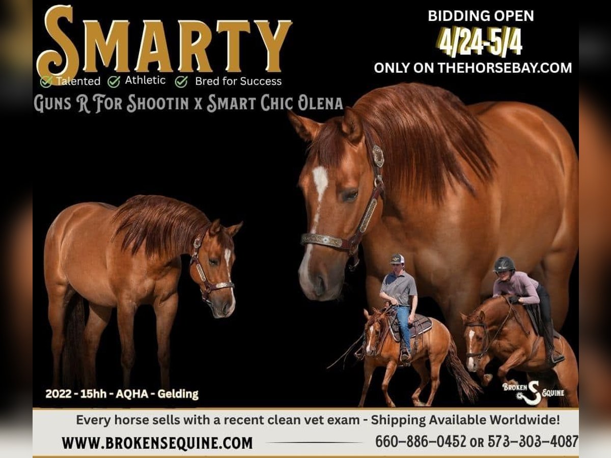 Smart Shooting Flash “Smarty” is a 2022 Quarter Horse gelding standing 15.1 hands tall. Smarty is by Guns R For Shootin (LTE $114,000+) out of a Smart Chic Olena mare. He checks a lot of boxes for both the amateur and professional alike. He has the size, handle, and buttons to excel in any program, in the discipline of your choice. He will shine in the ranch versatility and is an awesome head horse prospect. Under English tack, you have the perfect small and sporty Dressage or eventing partner. He has all the moves, mind, and just the right motor to succeed in any place you put him. He is Mr. Personality and is an easy horse to get along with. Under western tack, Smarty takes both his leads, has great departures, spins, and a huge stop. He is athletic and cowy, with loads of talent and a solid start. He’s been introduced to roping in the arena and has been used to move cattle and is a lot of fun to go sorting on. He has a great work ethic and handle that will make him stand out in any arena. Under English tack, Dressage Queens take note! Smarty really checks so many boxes for what a good dressage (or eventing) horse should be. He is light in the bridle, soft, and responsive. He is forward thinking and has just the right amount of sensitivity to be competitive through the levels. He has his changes, green, but they are there and has a very good basis of lateral work. This horse loves to work and have a job. He feels so good under you, the type of ride that makes you feel productive in every training session. He is also started over fences and has been super brave on the xc field. He has a great, adjustable stride and plenty of scope. On the trails, Smarty is happy to be out of the ring and loves to see new things. He crosses water, roads, bridges and more. We have taken him on lots of off property schooling trips, trail rides, and clinics. He’s used to loading up and going new places. Smarty is a good boy to travel and trailer and is easy to get along with. In the barn, Smarty is full of personality. He has great ground manners and enjoys being around people. He is happy living inside or out and gets along well with his pasture mates. ⚫️Smarty is an easy keeper that requires no maintenance.