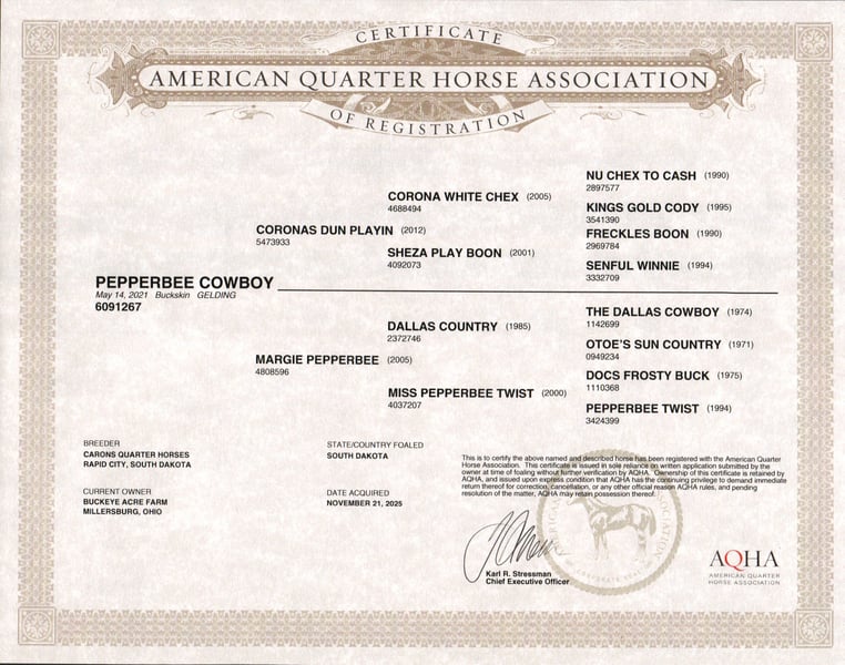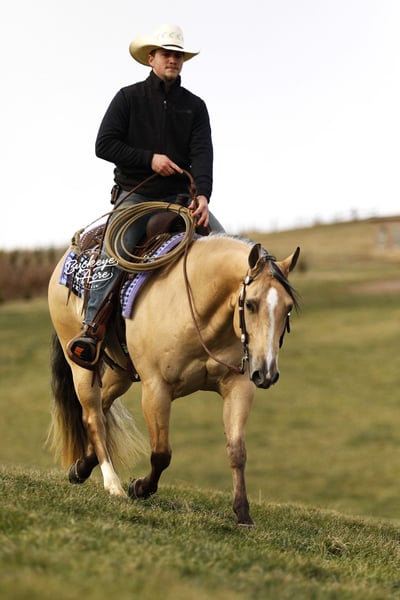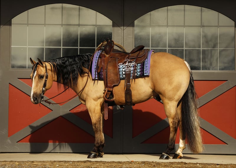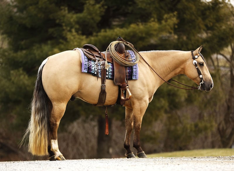 Perfection — and truly, his name could not be more fitting. This exceptional 2021 model AQHA gelding, with breeding going back to Hall of Fame Nu Chex To Cash, is the kind of horse that stops people in their tracks. Standing a strong 14.1 hands, he wears a rare and eye-catching buttermilk buckskin coat, highlighted by one white hind sock and a neat white blaze. His long, flowing mane and tail, complete with that unique coon-tail look, perfectly complement his outstanding, one-in-a-million conformation. Whether he is grazing in the field or standing quietly in the barn, Perfection naturally draws attention and admiration wherever he goes. Beyond his striking looks, Perfection is the total package under saddle. He has been ridden extensively in a wide variety of settings and truly does not miss a beat. From busy state roads with traffic to peaceful trail rides—both alone and in a group—he takes everything in stride with a calm, willing attitude. He has confidently covered miles of trail, navigating uphill and downhill terrain, stepping over downed logs, and crossing creeks and water without hesitation. He has also been used regularly to check cattle, fence lines, and back pastures, showing his dependable, ranch-hand reliability. Perfection offers very good, comfortable gaits that make long days in the saddle a pleasure. His walk and trot are relaxed and steady, his extended trot is smooth and balanced, and his lope is easy, rhythmic, and exceptionally comfortable to sit. He neck reins nicely, side passes with ease, knows his leads, and responds willingly to his rider. He has been ridden in both indoor and outdoor arenas, and new environments simply do not faze him. This gelding is truly versatile. He has been ridden western, English, bareback, and even bridle less, always staying honest and attentive. He has excelled as a heel horse and genuinely enjoys working cattle, making him equally suitable for ranch work, arena riding, or pleasure and trail riding. His kind nature and steady mind make him safe and enjoyable for beginners, seniors, and advanced riders alike. On the ground, Perfection is just as special. He is easy to manage in the barn, stands quietly in the wash bay, and is respectful and cooperative for the farrier. He is often the first one to greet you at the gate, eager for attention and interaction. He truly wants to be your friend and is happiest when he is with his person, ready to go wherever the day may take you. Perfection is up to date on vaccinations, deworming, and farrier care. If this sounds like the horse you have been looking for, please feel free to reach out to Duane at 330-231-2324 for more information or to schedule a day to stop by the farm.