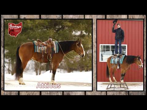 If you are looking for the total package wrapped in chrome, class, and character, Atticus could be your guy. Standing a strong and sturdy 14.2 hands, this 2021 Quarter Horse Cross Bay gelding is as eye-catching as they come, marked with four crisp white socks, a bold white blaze, and a rich black mane and tail that demand attention wherever he goes. He has that balanced, athletic build everyone loves, and he carries himself with confidence and presence whether he is in the arena or out on the trail. But his good looks are only the beginning. Atticus is a true gentleman inside and out — the first to meet you at the gate and happiest when he is by your side. He genuinely enjoys people and aims to please in everything he does. He is the kind that builds a connection quickly and wants to be your partner. In the barn he is quiet, respectful, and well-mannered. He stands tied, behaves in his stall, and is easy with other horses or perfectly content on his own. He hauls well, handles new places with confidence, and settles in without stress. Atticus has truly been there and done that. He has logged miles and miles on the trails, confidently crossing creeks, climbing hills, easing down steep slopes, and stepping over logs without hesitation. He has been ridden on state roads in traffic and remains steady and level-headed. Traps, whips, jugs, commotion — none of it phases him. He keeps a calm mind and is the same dependable horse every time you swing a leg over. If you are looking for something extra special, Atticus brings the wow factor. He will sit down on cue, step up onto a pedestal, and you can even stand on top of him. He enjoys having a job and showing off what he knows, always willing and always trying his best for his rider. Under saddle he is smooth, balanced, and correct in all his gaits with a comfortable stride you can ride all day. He side passes, picks up both leads with ease, neck reins confidently, and rides soft in the bridle. He is responsive without being overly sensitive — forgiving and safe for a beginner, yet broke and refined enough for an advanced rider to truly appreciate. He can even ride bridle less, which speaks volumes about his training and willingness. With his standout color, solid training, kind heart, and steady mind, Atticus is the kind that does not come along every day. From the arena lights to long trail rides, he is ready to be someone’s trusted partner and turn heads while doing it. If this sounds like the horse that you have been looking for, please feel free to reach out to Duane @ 330-231-2324