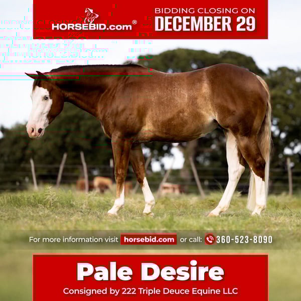 ⚜️ 𝓗𝓮𝓻𝓲𝓽𝓪𝓰𝓮 𝐖𝐢𝐧𝐭𝐞𝐫 𝓒𝓵𝓪𝓼𝓼𝓲𝓬⚜️ Happening now thru MONDAY | DECEMBER 29th - Available EXCLUSIVELY on HorseBid's website! For more details and to register visit: www.Horsebid.com CONSIGNOR CONTACT: 222 Triple Deuce Equine LLC 360-523-8090 LOCATION: Cisco, TX BREED: AQHA & APHA *DUAL REGISTRATION* REGISTERED: Yes REGISTERED NAME: Pale Desire 👑ROYAL CROWN ELIGIBLE👑 COLOR: Sorrel Overo HEIGHT: 14.2 AGE: 4 GENDER: Gelding Pale Desire, aka JoJo, is an eye-catching 4-year-old gelding registered with both AQHA and APHA. He is a son of the NRHA 5 Million Dollar Sire, Pale Face Dunnit, who is sired by the great Colonels Smoking Gun. JoJo’s dam is by Dual N Play, sired by NCHA Open Classic Champion Dual Pep. Jojo is a cool mashup of legendary reining horses, crossed with a proven set of champion cutters! On top of all that, he is ROYAL CROWN ELIGIBLE! 👑 We personally own this gelding and know him from head to hoof. Jojo has excelled in our program and has won over the hearts of all who have met and ridden him. We 100% stand behind Jojo and know you will love him the same way we do. We only sell our best horses, why you may ask? Well because it’s our livelihood and we simply can’t hog them all! JoJo is absolutely one-hand broke and ready to take to the show pen or roping arena. Jojo has been shown in the AQHA ranch riding and ranch rail. He was also Circuit Champion in the All-Breed Ranch Rail. Jojo is also started nicely on the head and heel side and would really stand out in a rope horse futurity program. He is a great hand on the ranch as well. JoJo neck reins great, is very soft in the bridle, and has smooth lead departures. His sweet and curious demeanor allows advanced kids to enjoy him as well! JoJo has proven to be a safe, solid, and sane mount. He is user friendly and packed with ability and talent. At the young age of four, he improves daily and shows more and more promise. It’s hard to come by horses like him that will last you a lifetime. JoJo has X-rays available on file, a fresh negative Coggins test, a clean health certificate, and has had zero exposure to the EHV-1 virus that has appeared in the last 30 days. This gelding is blemish free, has good feet and great conformation. AQHA and APHA papers are in hand. Jojo is slick, shiny, show fit and ready. He truly is just as beautiful as he looks. Jojo will come with a new full set of shoes, his winter blanket and his halter. Please enjoy JoJos current pictures and video. Feel free to call us with any questions that you may have. Shipping is available nationwide, we have insured haulers ready to bring Jojo to your door. Jojo is currently located in Cisco TX. Brayden 307-630-3578 Anna 360-523-8090