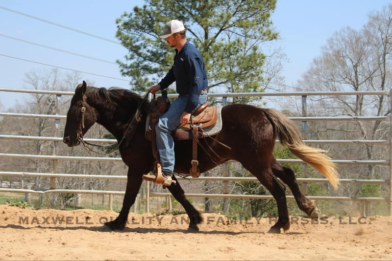ONLINE AUCTION Place your bids at www.PlatinumEquineAuction.com Starting Bid $3500 Auction ends April 13th, 2025 Need a new saddle? Check out White Rock Saddles on our website or Facebook! Sammy is a 4yr old 14.3h Friesian/Quarter horse cross gelding! Sammy is a very unique Chocolate color with a flaxen mane and tail. He is stocky and built to last. Sammy has a great personality that anyone would love and he is always the first one to greet you in the pasture! He has a very solid wtc that anyone could sit. He takes his leads and lopes nice cirlces. We have taken him on trail rides in the mountains where he will cross anything that you ask from deadfall to creeks to ditches, steep slopes don’t bother him either and also done tons of riding along the side the highway. He will ride Western or English and would be a great horse to go over the rails! Here is a super safe and calm minded gelding!! He is 100% Safe and Sound! We are located in Cherryville, NC if you would like to schedule an appointment to come see him and we can set up delivery anywhere in the US! If you have any questions, would like to facetime call or come see Sammy in person Call or Text Landon with Maxwell Family Trail Horses 704-689-9035. ONLINE AUCTION Place your bids at www.PlatinumEquineAuction.com Starting Bid $3500 Auction ends April 13th, 2025 Need a new saddle? Check out White Rock Saddles on our website or Facebook!