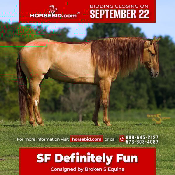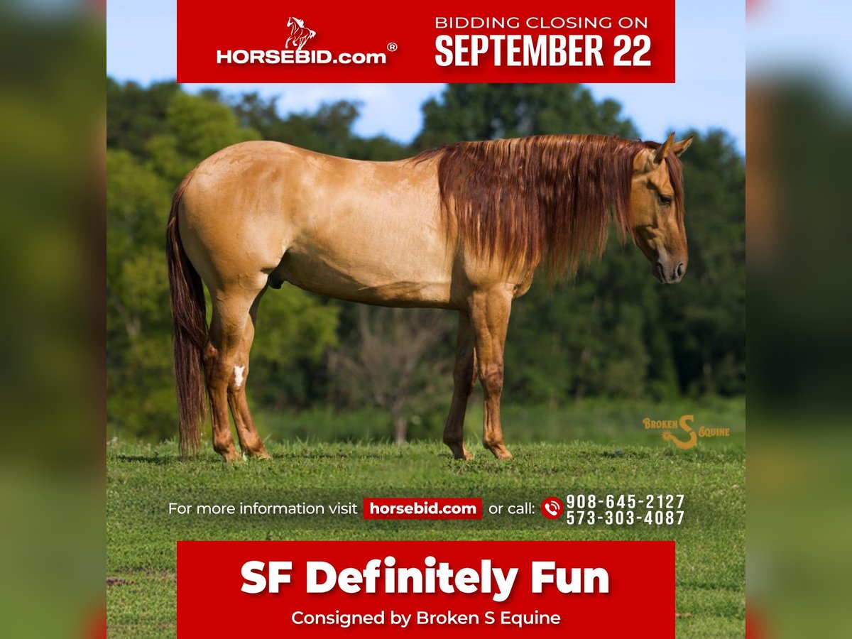 🍁𝒕𝒉𝒆 𝐅𝐀𝐋𝐋 𝑺𝒑𝒆𝒄𝒕𝒂𝒄𝒖𝒍𝒂𝒓🍁 Happening now thru MONDAY | SEPTEMBER 22nd - Available EXCLUSIVELY on HorseBid's website! For more details and to register visit: www.Horsebid.com CONSIGNOR CONTACT: Broken S Equine Kieran 908-645-2127 or Beau 573-303-4087 LOCATION: Bogard, MO BREED: Quarter Horse REGISTERED: Yes REGISTERED NAME: SF Definitely Fun COLOR: Dun HEIGHT: 14.3 AGE: 4 GENDER: Gelding SF Definitely Fun “Sunny” is a 4 year old registered Quarter Horse gelding standing 14.3 hands high. To sum this horse up in one sentence is to call him a true professional. No matter where you take him, what job you ask of him, or what rider you put on his back, he is always putting his best foot forward. There is never any funny business, he steps out of the stall or off the trailer and does his job every time, safely and happily. Sunny is a son of Dun It With A Twist NRHA lifetime earnings of 108k+ and out of a daughter Metallic Cat! Sunny is broke the best both under western and English tack. He has been started on the heel side has powerful spins, a big stop, and a great handle on him. He’s pushed cows, worked in the stock yards, and cleans up for the show pen as well. You can take Sunny anywhere, let the kids ride him in lessons, trail ride, try new things, and always know you have a solid and dependable parter with you. Sunny is a horse with all of the brains, athletic ability, sense, and versatility that you could ever want. You can accomplish anything with a horse that is trustworthy, professional, and sensible in any situation. In the ring, Sunny is educated with a solid reining foundation. He knows all the lateral work, has a huge stop and will perform all maneuvers He has good transitions, picks up both leads, and lopes nice circles. Under English tack, he works well of both seat and leg cues, and will ride in a frame or on a looser rein. He puts together dressage tests and rides like a dream in English tack. Sunny has the athleticism and responsiveness to do any job, yet is still quiet and forgiving enough for the kids to ride in lessons, and inexperienced riders to safely enjoy and take on the trails. He is super brave jumping both in the ring, and out on the cross country field. Most of his jumping miles are on the field and on hunter paces, he is smart with his feet, scopey, and is plenty brave. On the trails and off property, Sunny is always my first pick. There is no terrain too rugged, or place too scary. He bravely carries his rider safely in any environment, and loves to explore! Steep hills, deep water, and more are no problem for him. He has seen all the livestock, been roped off of, open and closed gates, pushed cattle, and more. He is dependable and level headed no matter if you are working cows or going on a leisurely trail ride with friends. He rides alone, in a group, and is the same on or off property. There has been no drama, and no concern that he will put a foot wrong across all of the places we've been, and tests we have put him through. He is the same ride, every time, no matter the circumstance, and that is something you can't train into a horse, they either have that or they don't! ⚫️Sunny is an easy keeper that requires no maintenance. We have a recent, clean vet check on file. ⚫️Our program aims to train and produce top quality horses and ponies for all disciplines and experience levels. Check out our website for testimonials! ⚫️We are located in Bogard, MO. We can help you arrange shipping anywhere! ⚫️For more information about Sunny, or any of our other horses call or text us. Kieran 908-645-2127 Beau 573-303-4087