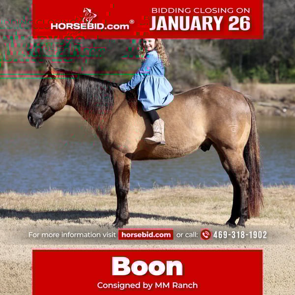 𝐉𝐀𝐍𝐔𝐀𝐑𝐘 ⭐️𝑨𝒍𝒍 𝑺𝒕𝒂𝒓 𝑳𝒊𝒏𝒆𝒖𝒑⭐️ Happening now thru MONDAY | JANUARY 26th - Available EXCLUSIVELY on HorseBid's website! For more details and to register visit: www.Horsebid.com CONSIGNOR CONTACT: MM Ranch 469-318-1902 LOCATION: Forney, TX BREED: Quarter Horse REGISTERED: Yes REGISTERED NAME: POCO FRECKLED PINE COLOR: Grullo HEIGHT: 14.3 AGE: 5 GENDER: Gelding Boon is a AQHA registered grullo gelding!!! He is only 5 years old. “POCO FRECKLED PINE” barn name is Boon. He is stout 14.3 hands tall. He is that stunning grullo color you don’t see everyday. He is a 5 yr old that rides like an old seasoned been there done that ranch horse. He has fancy with all buttons. He had of a lot of money spent on him for professional training. He spins around like a reining horse, slides to stop, side passes to open and close gates, picks up both leads, etc.. He has the best rocking chair short lope. You just give him a little squeeze and he will step right into it. Very smooth and fun to ride. He is athletic and has a lot of cow sense. He has been used on the ranch giving him a good foundation in his training. You can rope off of him, check cattle, check fence, or just take him to trail ride. He crosses water, bridges, can ride him in any type of terrain. He will go out alone on trails too. He has been rode up in the mountains. Absolutely nothing brothers this horse. The best part is he is only 5 yrs old and has his whole life ahead of him. He is safe and easy to ride. You do not have to worry about getting bucked off or him running off. Absolutely no bad habits. He has that very sweet willing to please attitude. He will meet you at the gate to be caught. He loves being a part of everything you are doing. He is more like a big puppy. We can catch him fresh out of the pasture and just get on him and go. Good minded young sound geldings like this one are hard to find. Plus is absolutely gorgeous!! He is a very easy keeper. Requires no maintenance of any kind. He can go bare foot or put shoes on him. You can stall him or turn him out. Doesn’t matter to him. He sells 100% sounds in every way with no issues. He did have a pre vet evaluation done included in the pictures. If you have anymore questions about him feel free to call. We would love to visit with you about him. We can help you arrange fast affordable shipping anywhere. He is up to date on all vaccinations, worming, had his teeth checked, feet. He is ready to go to his new home.
