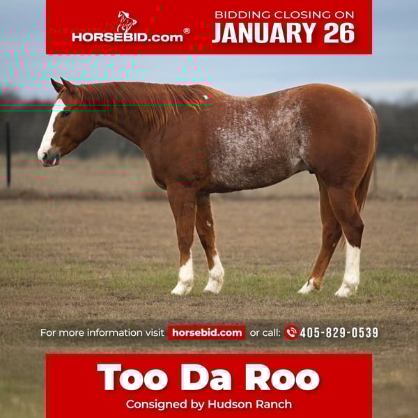 𝐉𝐀𝐍𝐔𝐀𝐑𝐘 ⭐️𝑨𝒍𝒍 𝑺𝒕𝒂𝒓 𝑳𝒊𝒏𝒆𝒖𝒑⭐️ Happening now thru MONDAY | JANUARY 26th - Available EXCLUSIVELY on HorseBid's website! For more details and to register visit: www.Horsebid.com CONSIGNOR CONTACT: Hudson Ranch 405-829-0539 LOCATION: Burleson, TX BREED: Quarterhorse REGISTERED: Yes REGISTERED NAME: Too da roo COLOR: Sorrel HEIGHT: 15 AGE: 5 GENDER: Gelding Roo is a 5 year old gelding that has been used for all aspects of ranch work, he has been used outside extensively, doctored yearlings on wheat pasture, he would make a nice barrel or team roping horse. He is feely and responsive to all ques. Roos pedigree speaks for itself he has the run/cow that everybody is looking for he is eligible for Ruby Buckle Triple Crown 100 Diamond Classic Young Guns Future Fortunes Breeders Challenge Select Stallion Stakes PESI Tomorrows Legends Colorado Classic Legends Of The South CN futurity TQHA