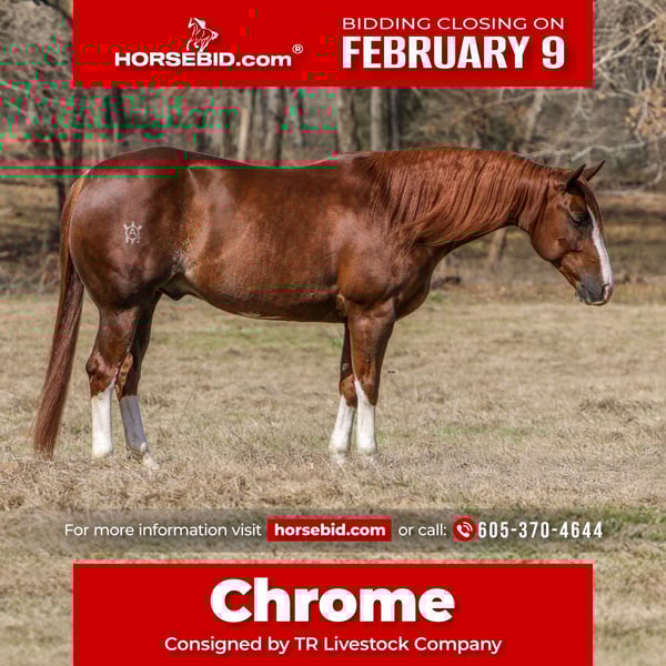 ❤️🔥𝑩𝒆 𝑴𝒊𝒏𝒆 𝐒𝐄𝐋𝐄𝐂𝐓❤️🔥 Happening now thru MONDAY | FEBRUARY 9th - Available EXCLUSIVELY on HorseBid's website! For more details and to register visit: www.Horsebid.com CONSIGNOR CONTACT: TR Livestock Company 605-370-4644 LOCATION: Rusk, TX BREED: AQHA REGISTERED: Yes REGISTERED NAME: COLOR: Sorrel HEIGHT: 15 AGE: 5 GENDER: Gelding Meet Chrome! The kind everyone hopes to find. He stands 15 hands tall and is stout! He is clean legged, straight and correct in every! Chrome is a standout gelding with the pedigree, mind, and heart that’s getting harder and harder to come by. He is finished in the reining and is strong and correct in all of his maneuvers. He’s smooth, balanced, and honest, with the kind of feel that makes him enjoyable to ride whether you’re polishing things up or just going for a relaxing ride. He wants to do his job right and takes pride in it, giving you the same try every time you swing a leg over. This is the kind of gelding you can take in multiple directions and enjoy every step of the way. What truly sets Chrome apart is he is as gentle and kind as they come if you can pick up the bridle reins, you can ride him. He doesn’t need warming up, babysitting, or explaining. He’s forgiving, dependable, and always willing, making him suitable for absolutely anyone, from seasoned riders to those who just want a safe, trustworthy partner. On the ground, Chrome is a true gentleman and has a sweet in your pocket personality! He’s excellent to bathe, shoe, tie, and trailer. Out on the ranch, he’s reliable and sensible, and on the trails he’s a pleasure to ride, quiet, and steady. He’s good with traffic and all the everyday sights and sounds, taking everything in stride. He’s not just a talented horse with a great pedigree, he’s a partner, a confidence builder, and one you look forward to riding every single day. Horses like him don’t come along often, and when they do, they’re usually the ones that stay forever. If you’re looking for a kind, versatile, gelding with an exceptional mind, Chrome is the real deal! 📍Chrome is located in Rusk Texas, nationwide shipping is available! 🐴PPE’s welcomed at buyers expense! ☎️Please call Rachel with any questions! 605-370-4644