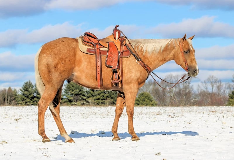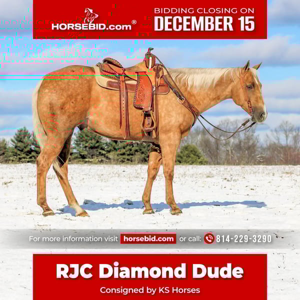 🎄𝐓𝐇𝐄 𝑯𝒐𝒍𝒊𝒅𝒂𝒚 𝐂𝐋𝐀𝐒𝐒𝐈𝐂🎄 Happening now thru MONDAY | DECEMBER 15th - Available EXCLUSIVELY on HorseBid's website! For more details and to register visit: www.Horsebid.com CONSIGNOR CONTACT: KS Horses 814-229-3290 LOCATION: Clarion, PA BREED: QH REGISTERED: Yes REGISTERED NAME: RJC Diamond Dude COLOR: Palomino HEIGHT: 15.2 AGE: 4 GENDER: Gelding RJC Diamond Dude is a Coming 5 Year Old Registered American Quarter Horse Gelding. Standing 15.2 hands tall. Wow Check Him Out!! Super Good Looking and Super Good Broke To Ride!! Very Quiet and Gentle! RJC Diamond Dude is the whole package and the kind of horse everyone is looking for and the kind of horse that is hard to find! RJC Diamond Dude is only 5 years old and has his whole life ahead of him. He is seasoned way beyond his years. He rides and acts like a horse twice his age. You will look long and hard to find a horse as broke and gentle as him. He has a super smooth trot, and super easy to sit rocking chair lope. Nice head set , neck rein and good stop. He is the same horse each and every time you ride him. Let him sit long periods of time without being ridden and he will stay quiet and gentle each and every time. He would be suitable for every member of the family to ride with how quiet and safe he is. He is great on the trails and goes anywhere you point him. He is traffic safe and good around four wheelers and bikes and farm equipment. He would make a great lesson horse. If your timid rider and need a confidence boost he would be the kind of horse that would help you regain your confidence. He could also be a ranch horse. The skys the limit for RJC Diamond Dude! He is the complete all around package! Dont miss out on this great opportunity to own such a cool horse! We can help arrange shipping anywhere in the United States. He had a Health and Lameness Exam on 12-1-25 which he passed everything. Feel Free to Call Kris at 814-229-3290. Thank You and God Bless!