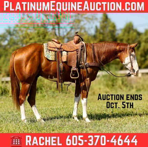 ONLINE AUCTION Place your bids at www.PlatinumEquineAuction.com Starting Bid $3500 Auction ends October 5th, 2025 Need a new saddle? Check out White Rock Saddles on our website or Facebook Slow Wet Kisses AKA Monty is a 15.3h, 4 year old, he is registered with APHA, PHA, and NSBA! Monty is a gorgeous Sorrel gelding, with 4 tall white feet, a bald face and one blue eye making him super eye catching and sure to catch everyone’s attention! Monty is a very sweet and personable gelding, he meets you at the gate and is wants to be your best friend! He is absolutely gentle and quiet to be around, stands for saddling, bridling and bathing! Monty has a good start in the arena, he lopes nice collected circles, has a soft stop and is very smart and willing to learn. Monty has also been rode alot outside, he is level headed and not spooky. He has been trail rode extensively outside and has been hauled to multiple trail camps and handles new places very well. If you’re looking for a super sweet young gelding that is gentle and safe for anyone but also a great prospect to finish in any direction be sure to check him out! Monty is located in Rusk TX, nationwide shipping is available! 𝐏𝐥𝐞𝐚𝐬𝐞 𝐫𝐞𝐚𝐜𝐡 𝐨𝐮𝐭 𝐭𝐨 TR Livestock 𝐰𝐢𝐭𝐡 𝐚𝐧𝐲 𝐪𝐮𝐞𝐬𝐭𝐢𝐨𝐧𝐬, (Rachel) 605-370-4644. ONLINE AUCTION Place your bids at www.PlatinumEquineAuction.com Starting Bid $3500 Auction ends October 5th, 2025 Need a new saddle? Check out White Rock Saddles on our website or Facebook