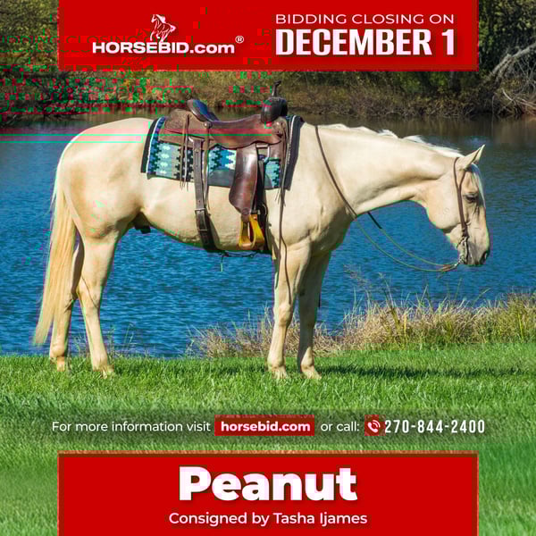 ⚜️ 𝓽𝓱𝓮 𝐇𝐨𝐫𝐬𝐞𝐦𝐚𝐧'𝐬 𝓢𝓱𝓸𝔀𝓬𝓪𝓼𝓮⚜️ Happening now thru MONDAY | DECEMBER 1st - Available EXCLUSIVELY on HorseBid's website! For more details and to register visit: www.Horsebid.com CONSIGNOR CONTACT: Tasha Ijames 270-844-2400 LOCATION: Henderson KY BREED: Quarter Horse REGISTERED: Yes REGISTERED NAME: RWS Rapid Dry 221 COLOR: Palomino HEIGHT: 15.3 AGE: 5 GENDER: Gelding Peanut AQHA 2020 RWS RAPID DRY 221 Peanut is a gorgeous 5 year old palomino gelding standing 15.3 hands tall. Peanut isn't just an eye catcher he is very broke and rides like one should. He will W/T/L, side pass and works off leg pressure. Peanut will walk all day if asked. He has a nice slow trot to him and transitions to a nice smooth lope. Peanut changes leads, circles with speed control and has a beautiful extended trot that would be ideal for the ranch riding! He neck reins with one hand or you can ride him two handed, responsive to leg cues, backs and has a big stop when asked. He is out standing on the trails and has been trail ridden through many different types of terrain. He is sure footed and honest. Peanut will cross creeks, go through any body type of water, thick brush, logs, bridges, rough terrain, up and down cliffs with ease and has been through all the obstacles. He has been rode on the road and is use to all kinds of traffic, heavy machinery and ATV’s. You can ride Peanut out alone with ease or with other horses. Peanut is young enough to go any direction you want. He is eager to learn. Peanut will stand still for you to get on him from the ground or a mounting block. He stands to be groomed, fly spray, stands still to be saddled, takes the bridle with ease, bathes good, loads like a dream, clips great, and stands for the farrier. We invite anyone and everyone to come meet and ride Peanut at our barn in Henderson, Kentucky. We are happy to assist with transportation arrangements. For any questions about Peanut please contact Tasha 270-844-2400