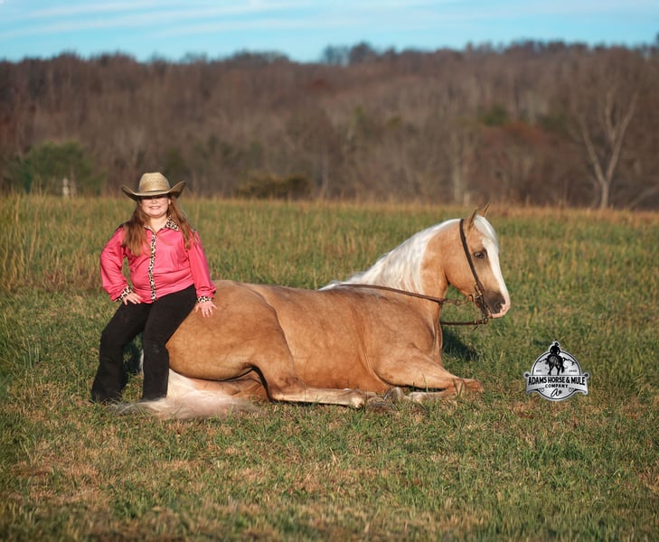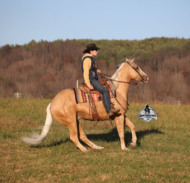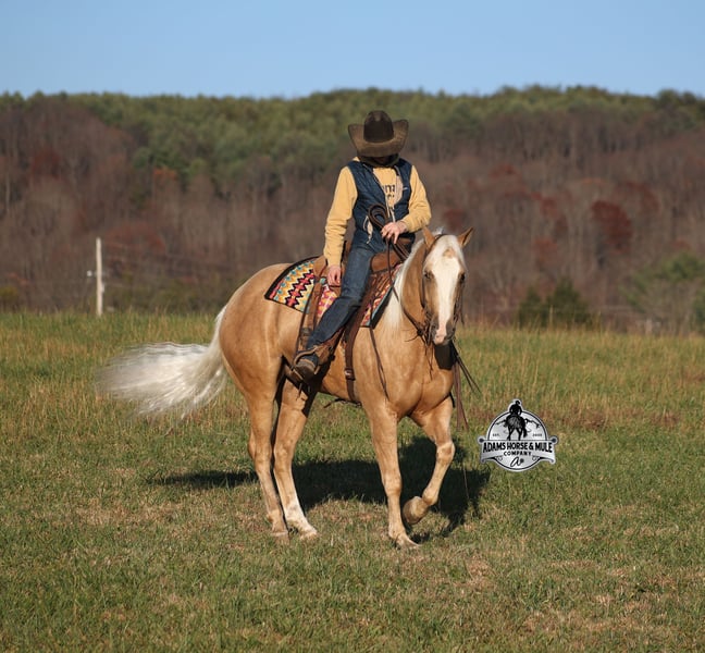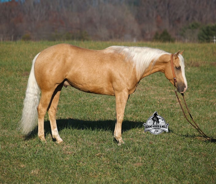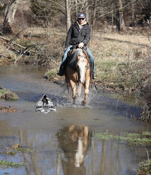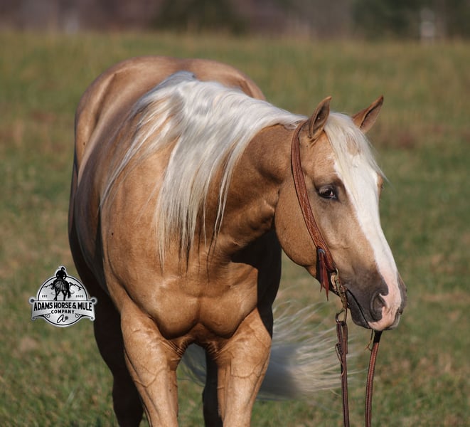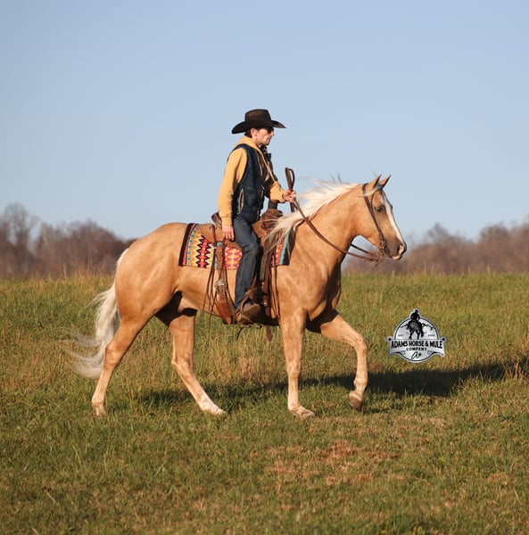 𝐀𝐝𝐚𝐦'𝐬 𝐇𝐨𝐫𝐬𝐞 & 𝐌𝐮𝐥𝐞 𝐂𝐨𝐦𝐩𝐚𝐧𝐲'𝐬 ✷𝑬𝒗𝒆𝒓𝒚 𝑴𝒊𝒍𝒆 𝑨 𝑴𝒆𝒎𝒐𝒓𝒚✷ 𝐄𝐗𝐂𝐋𝐔𝐒𝐈𝐕𝐄 𝐒𝐀𝐋𝐄 Happening now thru MONDAY | FEBRUARY 2nd - Available EXCLUSIVELY on HorseBid's website! For more details and to register visit: www.Horsebid.com CONSIGNOR CONTACT: Adams Horse and Mule Company 606-308-2461 LOCATION: Mt. Vernon, KY BREED: AQHA REGISTERED: Yes REGISTERED NAME: Wrens Blue Moon COLOR: Palomino HEIGHT: 15.3 AGE: 5 GENDER: Gelding If Wren was on the "Tinder" dating app, you'd certainly want to swipe up on his profile!!! This lover boy named Wrens Blue Moon is an amazing 15.3h, 2021 model, AQHA Reg, G-O-L-D-E-N Palomino, gelding that looks great and rides great too! Wren is stout enough to carry a bigger sized rider and gentle enough to carry the little ones as well! The only tricks to this guy are the ones that you ask for! Wren is trained to lay down on command. He has been used out on the ranch in all aspect of ranch work. From roping and doctoring to sorting, he has plenty of cow sense. He has been ridden around Rodeo venues, sorted and loaded the bulls. Lights, the announcers, crowd roaring... nothing phases him! Wren has been roped on out of the box and trails the roping dummy. Wren is totally user friendly to ride as he lopes slow and easy, with the reins draped, in perfect circles. He is very well trained and spins circles correctly both ways and slide stops… he has the moves to go along with the good looks! If the ranch work is done and you just want to go for a relaxing trail ride… steep slopes, rocky terrain, creeks, logs, ditches… he crosses it all with ease and is never in a hurry! He has been started jumping over the rails and logs too. Wren is a horse that can handle any task and will take care of the whole family! Eye appeal, Pedigree, Training, Experience, Versatility, Safety… his profile is complete and he is looking for his soul mate!!! Call for more info Eric 606-308-2461