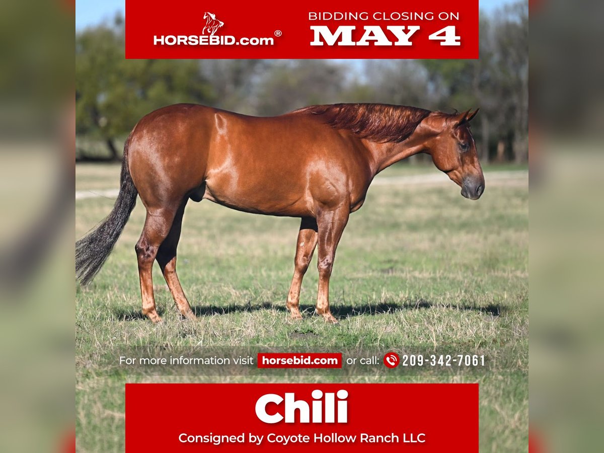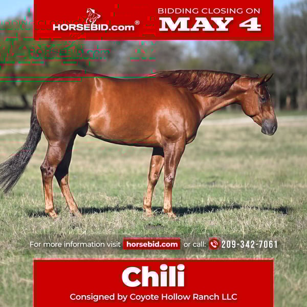 ▪️▫️◾️𝐭𝐡𝐞 𝑴𝒂𝒚 𝐒𝐞𝐥𝐞𝐜𝐭◾️▫️▪️ Happening now thru MONDAY | MAY 4th - Available EXCLUSIVELY on HorseBid's website! For more details and to register visit: www.Horsebid.com CONSIGNOR CONTACT: Coyote Hollow Ranch LLC 209-342-7061 LOCATION: Waco, TX BREED: AQHA REGISTERED: Yes REGISTERED NAME: OH FOR FLINNS SAKE COLOR: Sorrel HEIGHT: 15.1 AGE: 5 GENDER: Gelding “Chili” – The Ultimate All-Around Gelding If you are looking for a horse that is as talented as he is kind, look no further. We are proud to offer Chili, a standout gelding who has been a part of our program for over 6 months. The Background: Chili was born and raised at his original owner’s place and stayed with them his entire life until he came to us. He has been lightly shown in the reining and is a true “stand-up citizen” in every sense of the word. Chili is solid in his reining foundation. He is strong in his stops, has beautiful circles, effortless lead changes, and quick, correct turnarounds. He is a pleasure to ride and has the talent to be competitive. Since bringing him into our program, we have expanded his horizons. We’ve roped on him and logged plenty of miles riding him outside. He has gained valuable “real-life” experience, making him a versatile partner who is ready to go in any direction—whether you want to head back to the show pen or hit the trails. Chili is in absolutely perfect condition. He is clean-legged with not a single blemish or scar on him. He is being sold with a clean bill of health and a vet letter, so you can buy with total confidence. This is a rare opportunity to own a horse with a lifetime of consistent care and professional training. He is ready to find his next partner. 📍 Located in Waco, TX📩 Call/Text Chelsea at 209-342-7061 Nationwide shipping available and handled seamlessly.