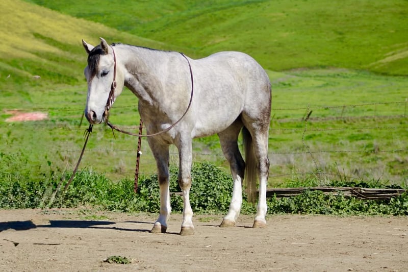 "AVAILABLE ON ONLINE HORSE AUCTION AT www DOT PlatinumEquineAuction DOT com BIDDING OPEN NOW thru SUNDAY | FEBRUARY 22ND! *Final price will be determined on auction site* CONSIGNOR CONTACT INFO: Longhorn Ranch 831-537-1915 LOCATION: Paicines, CA Booties Grey Gelding • 5 Years Old 14.3 hands If you appreciate a young horse with a big heart, a great mind, and a foundation that’s already heading in the right direction, Booties is one you’ll want to meet. This classy grey gelding with four white socks is the kind that makes you smile every time you ride him. He is extremely friendly, people-oriented, and a true pleasure to be around both in and out of the saddle. Booties has a solid start and works off a correct, uncomplicated foundation. He walks, trots, and lopes willingly, stays relaxed, and travels in nice, balanced circles. He carries himself with confidence and composure and feels more like a seasoned horse than one his age. Out on the trail, Booties is quiet, steady, and sensible. He goes along handling new surroundings with ease. He has been exposed to obstacles, flags, and tarps, and approaches everything with a calm, willing attitude. Nothing seems to worry this gelding — no buck, no bolt, and absolutely no silliness. Booties has been used to gather cattle and shows a lot of interest in them. We have roped the sled on him, and he is taking to it nicely, showing good try and a great attitude about his work. What truly sets Booties apart is his mind. He is level-headed, honest, and always tries to do the right thing. We feel he is gentle enough for beginners and would make a great youth horse with his willing, people-pleasing attitude, while seasoned riders will enjoy him just as much. Booties is such a pleasure to be around and ride, and truly feels like a special one in the making. Whether you’re looking for a solid trail partner, a nice arena horse, or a young horse to continue developing, Booties checks all the right boxes. Longhorn Ranch Paicines, California Dina – 831-537-1915 Shipping assistance available nationwide.