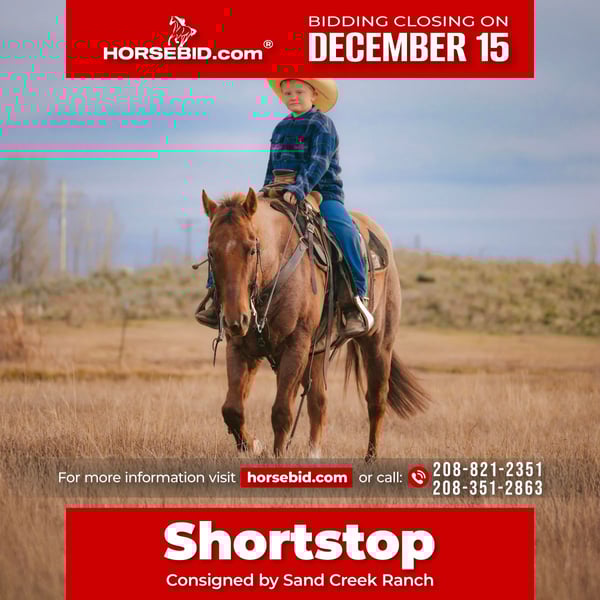 🎄𝐓𝐇𝐄 𝑯𝒐𝒍𝒊𝒅𝒂𝒚 𝐂𝐋𝐀𝐒𝐒𝐈𝐂🎄 Happening now thru MONDAY | DECEMBER 15th - Available EXCLUSIVELY on HorseBid's website! For more details and to register visit: www.Horsebid.com CONSIGNOR CONTACT: Sand Creek Ranch 208-821-2351 or 208-351-2863 LOCATION: Saint Anthony ID BREED: Quarter Horse REGISTERED: Yes REGISTERED NAME: JS Metallic Style COLOR: Red Roan HEIGHT: 14.3 AGE: 6 GENDER: Gelding Shortstop is a pretty red roan 6 year old AQHA gelding. Shortstop has very kind eyes and has an in your pocket type personality. This gelding has so many good qualities and gets better every time we swing a leg over him. He loves attention, and is easy for most anyone to ride him. We have used him as a lesson horse for our 5 year old to learn on, and he is our 7 year olds go to horse right now. He rides him anywhere and everywhere. Shortstop has more whoa than go and is happy to as fast or slow as his rider likes. Shortstop has a reining foundation and was shown extensively all of 2023 in Stock Horse classes, ACHA Ranch Riding, Ranch Trail and Reining. His 2023 accomplishments include RMOHA Champion in Jr. Reining, RMQHA 6th in Jr. Ranch Trail, top 10 in CoWN, Top 5 in Open Jr. Reining at the AQHA World Show. He was a World Show Qualifer in 6 events. His performance record: He is an earner of 4 AQHA points. In 2023: 5th AQHA World Junior Reining L2 Open; in ACHA competi-tion: reining (Level 3), 1 ranch trail point in open events. He stands around 14.3 hands. Shortstop is no stranger to a days work and has been rode out on the trails, in the mountains and in the arena. Not only is Shortstop fun to ride in the arena but he knows how to maneuver his way around rocks, logs, brush, and other obstacles, and does it with ease. Shortstop rides with his head low, collects up nicely, picks up his leads, spins and has a good stop to him. We have tracked the dummy on him and he gets right in there for a shot. Shortstop is a gentleman to be around, has good manners on the ground and in the saddle. This nice gelding is no stranger to obstacle courses, whips, tarps, noodles, plastic bags, ropes, etc… Shortstop is one of the favorites on the place. He puts a smile on your face every time you ride. He has had many different riders on him and he handles them all with care. This gelding can go in any direction you want to take him. From the trails to the show pen he can do it all. Shortstop is the total package! He sells with a current PPE taken December 4, 2025.