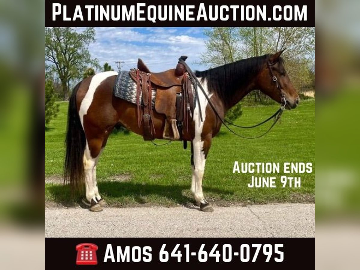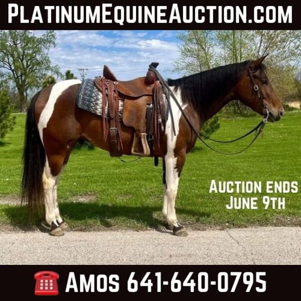 ONLINE AUCTION Place your bids at www.PlatinumEquineAuction.com Starting Bid $3500 Auction ends June 9th, 2024 Need a new saddle? Check out White Rock Saddles on our website or Facebook! Stetson is a 4 year old paint gelding. He stands at 14.3 hands now, but should mature to about 15-15.1 hands when he’s done growing. He has an amazing disposition, and confirmation! We have enjoyed every day of owning him, and hope to see someone else love him as much as we have. Stetson is a natural gentleman, and is as chill as a horse can get- as you’ll see in the video. This horse has seen a lot for just being four years old. He has been packed on and rode in the Colorado mountains, many overnight camping trips, trail rides, and cattle sorts, and has even been shown the barrel pattern. There is nothing that we have pointed him to that he won’t cross with ease; Any kind of water such as rivers, fast creeks, ponds, steep ditches, trail courses, highways, stumps and logs, and bridges to say the least. This horse has been so very gentle and a COMPLETE natural from the beginning. Although Stetson is not registered, you can see how there is no way he is not bred to be athletic! Don’t let his calm nature fool you; He will get up and lope off confidently at whatever speed you please from just the squeeze of your heels or click of your tongue. He takes the correct leads, one hand neck reins, backs, side passes, spins, and will ride bridleless. He is 100% sound, has great hooves and does not require shoes. Loads and backs out of the trailer, stands to be bathed, stands to be mounted/unmounted, stands for the farrier, and to be groomed, saddled, and bridled- all with ease. There really are no bad things to say about him! There is no spook, buck, kick, bite, or funny business at all. He is as good of a keeper as you can get: Eats well, is happy in a stall or pasture, easy to catch, and gets along with any and all horses, mules, donkeys, and dogs. This is all there is to say: There is no doubt that this horse is going to EXCEL in any category you decide to pursue him in, whether it be roping, barrel racing, gaming, ranch work, pleasure classes, english riding, a step up horse for the kids, or even just a good ole trail/family horse. He is a very GENTLE, naturally calm, forgiving, and willing gelding that is ready to start any job of your choosing. Please contact Amos Yoder 641-640-0795 with any questions. Located in Zearing, IA. ONLINE AUCTION Place your bids at www.PlatinumEquineAuction.com Starting Bid $3500 Auction ends June 9th, 2024 Need a new saddle? Check out White Rock Saddles on our website or Facebook!