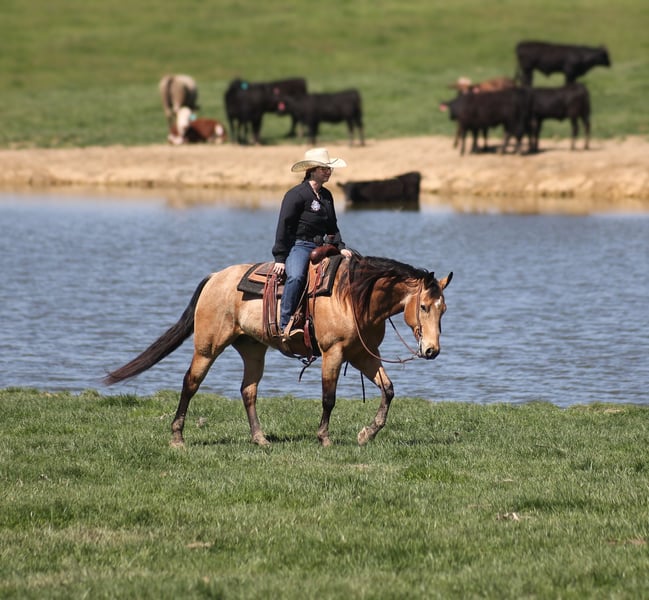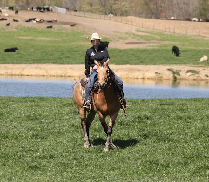ONLINE AUCTION Place your bids at www.PlatinumEquineAuction.com Starting Bid $3500 Auction ends June 29th, 2025 Need a new saddle? Check out White Rock Saddles on our website or Facebook! SG Zans Thriller will be the thill of your life! Zan is a 15h, stout built, 2020 model registered AQHA, golden buckskin gelding and that golden color goes all the way to his heart! Zan has the color and personality but wait there is more… Zan has a top notch pedigree with Paddys Irish Whiskey on the bottom side and Whimpys Little Step on the top side! He is bred to ride around and bred to do anything involving a cow! But the best part of him is that he is gentle and safe!!! The kids have ridden Zan down the trails and he is going to take care of any rider that is setting on him! He will pack a nervous beginner safely across creeks, over deadfall, up/down steep slopes and he will ensure that they have the most enjoyable ride! Zan has been our 12 year old daughters horse since last year and he has built her confidence levels in so many ways and helped her grow as a horseman. Zan has been ridden around the ranch, he has worked cows, roped and doctored sick ones at the feedlot. He has penned cattle at the stockyards, he has been used at an exotic sale to pen exotic wildlife including all sorts of deer, types of cattle, zebra and buffalo as well. Zan has been ridden at rodeo venues, loaded/unloaded bucking bulls and been ridden in the arena with the stands packed full of spectators. He is a pleasure to ride as he lopes perfect circles on a draped/loose rein, he has a smooth jog, a good stop, spins a circle both ways and backs with ease. If you need a horse that will help build your confidence that will take care of you on the trails or around the ranch and a horse that knows what do in situations where maybe you don’t… Zan is the horse for you! Contact Adams Horse & Mule Co. Eric 606-308-2461 with any questions, to make a buy it now offer, to schedule a time to come see Zan in person or we can do a facetime meet and greet as well. Zan comes with our 2 week satisfaction guarantee, that if he isn’t the right fit just bring him back and exchange him for a horse that suits you better, we want you to be happy so bid/buy with confidence! ONLINE AUCTION Place your bids at www.PlatinumEquineAuction.com Starting Bid $3500 Auction ends June 29th, 2025 Need a new saddle? Check out White Rock Saddles on our website or Facebook!