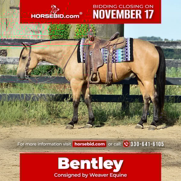 🎲𝓽𝓱𝓮 𝐑𝐈𝐃𝐄𝐑'𝐒 𝓒𝓱𝓸𝓲𝓬𝓮🎲 Happening now thru MONDAY | NOVEMBER 17th - Available EXCLUSIVELY on HorseBid's website! For more details and to register visit: www.Horsebid.com CONSIGNOR CONTACT: Weaver Equine 330-641-6105 LOCATION: Fredericksburg OH BREED: Quarter horse REGISTERED: No COLOR: Buckskin HEIGHT: 15.1 AGE: 6 GENDER: Gelding Bentley is a gorgeous 6-year-old quarter horse gelding. He is well broke to ride. He does great in the arena, out on trails, and in the traffic. He will lope a circle nicely. He will pick up both leads correctly. He will stand at a mounting block. He will cross most obstacles with ease. He will ride with or without a bridle. He does not mind a tarp or flag. He will back up nicely. he is a pretty buckskin color and has a super sweet attitude! he is a great horse, whether you prefer trail riding, arena riding, out with friends or alone, in the traffic, or just a leisure ride at home! he does an excellent job on the trails. he does not mind the hills. Crosses creeks and logs with ease. She will happily ride out alone or with a group. he has also been ridden out in traffic. he does great out and about! he does not mind loading and unloading on a trailer. This pretty guy is a point and go type. He will stand to tack and groom. He will pick his feet nicely. Does not mind bathing. He does great when turned out with other horses .Bentley is 100% sound and requires no maintenance! Feel free to reach out with any further questions! We look forward to hearing from you!