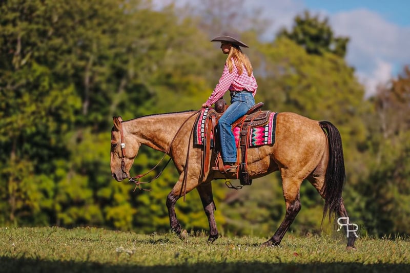 🎲𝓽𝓱𝓮 𝐑𝐈𝐃𝐄𝐑'𝐒 𝓒𝓱𝓸𝓲𝓬𝓮🎲 Happening now thru MONDAY | NOVEMBER 17th - Available EXCLUSIVELY on HorseBid's website! For more details and to register visit: www.Horsebid.com CONSIGNOR CONTACT: Double R Ranch Horses 931-623-1706 LOCATION: Lyles, TN BREED: Quarter Horse REGISTERED: Yes REGISTERED NAME: Flinging Lemons COLOR: Buckskin HEIGHT: 15.1 AGE: 5 GENDER: Gelding “Laredo” The Buckskin Everyone Loves! (And needs) If you’ve been searching for a safe, steady and easy to ride partner, the kind you can throw a saddle on any day of the week, point in any direction, and know you’re in good hands, meet Laredo. This golden dappled buckskin AQHA gelding is as easy on the eyes as he is steady in the saddle. He’s built right, and absolutely gorgeous- with a friendly, gentle personality that makes him so enjoyable to be around. Registered AQHA registered name “Flinging Lemons” with some impressive bloodlines, this 5 year old gelding stands 15.1 hands tall, has plenty of real-world experience, and a very good mind. Laredo is naturally friendly and loves attention, he is always ready to greet you at the gate. If you enjoy being around horses that are “in your pocket” you’ll love him. He has the kindest eyes and the sweetest soul, and he is ready to be your best bud. He’s quiet and patient on the ground, stands calmly to groom, saddle, and mount, and has excellent manners. Gentle and quiet, he loads, ties, bathes, and stands for the vet and farrier without fuss. He rides soft in the bridle, responds to leg cues, and is smooth and enjoyable. He has been trained to side pass over to pickup his rider on the mounting block as well, which is handy! Laredo has been a trusted trail partner with us. He’s safe, solid and has a good mind. He’s been my go-to choice when I need to pack a kid on board. He’s gone on overnight camping trips, where he crossed deep water, climbed steep rocky hills, and even explored miles of trails with our little one-year-old tucked in the baby carrier. He’s sure-footed, calm, and confident. New scenery doesn’t bother him, creeks, passing wildlife, or navigating through rough terrain, he handles it all with patience and a steady step. It’s easy to relax and enjoy the ride on a seasoned horse like him. You’ll feel at ease on his back! I’ve even hopped on him bareback in the dark and loped him off down the road, and he just calmly carries on like it’s nothing unusual for him. We have put him in about every situation you can think of, and he just proves himself rock solid again and again. He’s also been started on the head side, done a little bit of breakaway, lightly started on barrels, and used for ranch work including pasture roping, loading, doctoring etc. Laredo is versatile, well rounded, adaptable, and ready to succeed in whatever direction his next owner wants to take him. Even if that’s a best friend in horse form! It’s hard to find everything Laredo brings to the table- all in one horse. He has a To sum it all up, He’s just plain good. And in today’s world, that’s hard to find. Laredo passed his PPE by Equine Vet Todd Co Animal Clinic with flying colors! Located in Lyles, TN 📞 Contact Rachel Vick at 931-623-1706 to learn more or schedule a visit to meet Laredo in person.