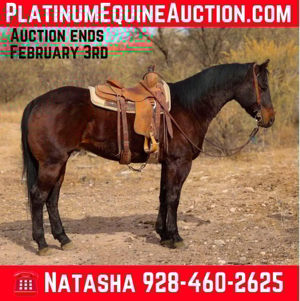 ONLINE AUCTION Place your bids at www.PlatinumEquineAuction.com Starting Bid $3500 Auction ends February 3rd, 2025 Need a new saddle? Check out White Rock Saddles on our website or Facebook! Fabio is a 2020 model AQHA gelding standing 15.1hh. This big, pretty, shapey gelding is an absolute pleasure to ride on the trails! Whether you’re headed into the rough rocky country, soft sandy dunes, heavy brushed trails, or the sidewalks of town, Fabio will be ready to go and take excellent care of you! We’ve rode countless of miles on this big pretty guy and not a thing phases him. Fabio will walk straight through rivers, step over logs, and bulldoze through any brush you may encounter! If you’re looking for a surefooted, safe, reliable trail horse then Fabio is your man!! Fabio is not only great to ride outside, but will also walk, trot, and lope both ways in the arena! Fabio will come with a clean coggins and health, as well as a lameness exam from my vet! Transport can easily be arranged anywhere in the US!! Located in Camp Verde, AZ. Contact D/C Equine Services Dallas 804-822-2233 or Natasha 928-460-2625. ONLINE AUCTION Place your bids at www.PlatinumEquineAuction.com Starting Bid $3500 Auction ends February 3rd, 2025 Need a new saddle? Check out White Rock Saddles on our website or Facebook!