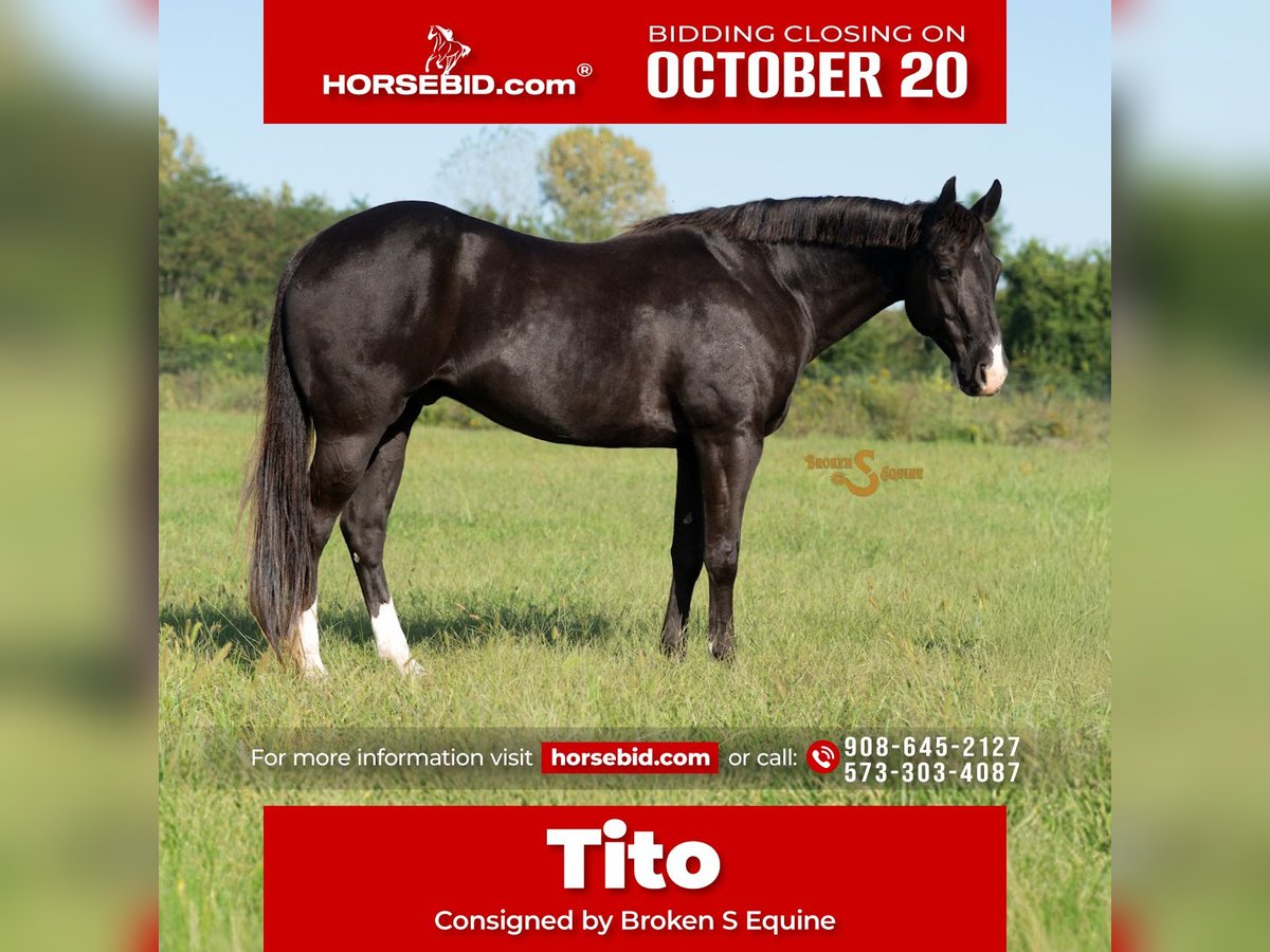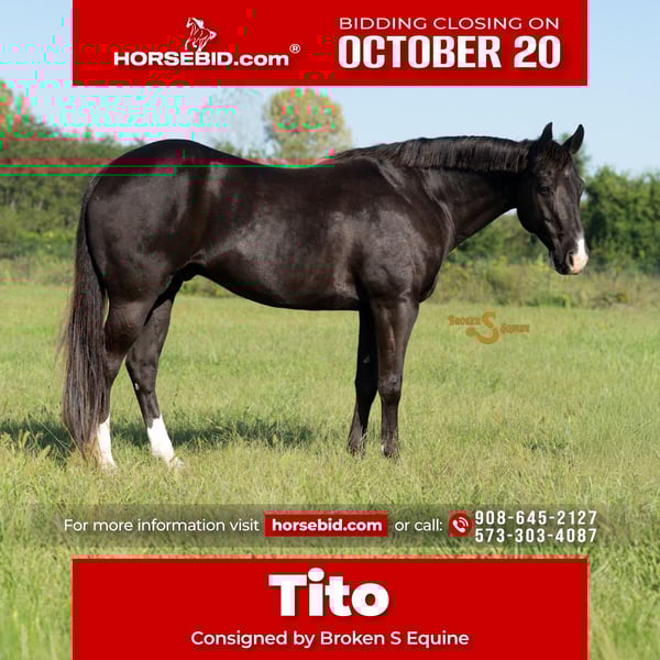 ♦️ 𝐭𝐡𝐞 𝐀𝐌𝐄𝐑𝐈𝐂𝐀𝐍 𝓕𝓪𝓵𝓵 𝓒𝓵𝓪𝓼𝓼𝓲𝓬 ♦️ Happening now thru MONDAY | OCTOBER 20th - Available EXCLUSIVELY on HorseBid's website! For more details and to register visit: www.Horsebid.com CONSIGNOR CONTACT: Broken S Equine Kieran 908-645-2127 or Beau 573-303-4087 LOCATION: Bogard, MO BREED: Quarter Horse REGISTERED: No COLOR: Black HEIGHT: 15.2 AGE: 5 GENDER: Gelding Tito is a 5 year old Quarter Horse gelding standing 15.2 hands high. If you want a horse that takes the stress of the day away and leaves you smiling, Tito is your man. Tito is the perfect confidence boosting ride for when you want to hit the cross country course, take a dressage lesson, or try out new things like working equitation or western dressage. His foundation is rock solid and as versatile as he is. From eventing, to trail riding, working in the stock yards, and even doing the mounted patrol prep course, Tito will safely do any job with you, whether your in an English saddle, or western. In the ring, Tito is one of my all time favorite horses. He has the talent and moves to shine in any show ring, and the brains to work with almost any rider. He is so easy and fun to flat. With great transitions, easy flying changes, and super lateral work, Tito is every trainers favorite, and every amateurs best friend. He is the type that makes his rider look good, and feel confident doing it. Over fences, Tito is DREAMY. He always, always gets his rider to the other side, and is a huge confidence booster, especially on the cross country course. He is great at finding the distance if his rider can't, and looks cute while doing it. I can't say enough good things about this horse's mentality when it comes to evening and dressage work. Everyone just truly enjoys working with him and lessoning on him. Every ride has ended in huge smiles and a great feeling of confidence. On the trails, Tito loves to explore and see new things. Everyone fights over who gets to take him out on hunter paces! He crosses all obstacles, water, hills, and roads. He is safe in traffic, rides though town, and is safe around hounds, dogs, and livestock. He is the type that would make a superb hunt partner too! He is used to loading up and going new places. He is safe, easy, and needs no prep. Go on a relaxing hack, take him out hunting, or throw the husband up for a trail ride! In the barn, Tito is a lover. He enjoys all of the pampering and attention he can get. He's a good boy for all of the usual barn activities, easy in every way, and drama free. He is happy living inside or out, and gets along with all of his pasture mates. ⚫️Tito is an easy keeper that requires no maintenance. We have a recent, clean vet check on file. ⚫️Our program aims to train and produce top quality horses and ponies for all disciplines and experience levels. ⚫️We are located in Bogard, MO. We can help you arrange shipping anywhere! ⚫️For more information about Tito, or any of our other horses call or text us. Kieran 908-645-2127 Beau 573-303-4087