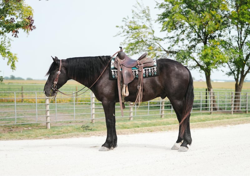 ONLINE AUCTION Place your bids at www.PlatinumEquineAuction.com Starting Bid $3500 Auction ends October 5th, 2025 Need a new saddle? Check out White Rock Saddles on our website or Facebook Trevor is a striking jet black, 5 year old, draftcross gelding who stands a solid 16h and is very stocky built. He is well broke to ride and drive single or double. He performs equally well in the arena or out on the trails. He will cross logs, ditches, muddy areas, scale steep slopes and handle rocky terrain with ease. He is totally confident, seasoned and very sure footed. He is happy to go alone or anywhere in a group setting. Trevor is totally quiet, a true family horse that any member of all ages can and will enjoy as he builds his riders confidence. In the arena he is well trained. He lopes nice circles, takes the correct leads, one hand neckreins, has a good stop, backs, and side passes. Trevor is very friendly, he will meet you at the gate and loves attention. He just wants to be everyone’s best friend! Whether you ride him once a month or twice a year he will always be the same safe, smart and gentle horse! He sells 100% sound and sane. For more info call Ervin Hershberger 260-977-9095 with any questions. Located in Independence, IA. ONLINE AUCTION Place your bids at www.PlatinumEquineAuction.com Starting Bid $3500 Auction ends October 5th, 2025 Need a new saddle? Check out White Rock Saddles on our website or Facebook