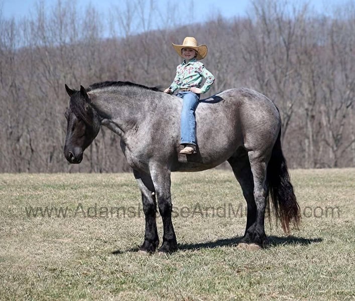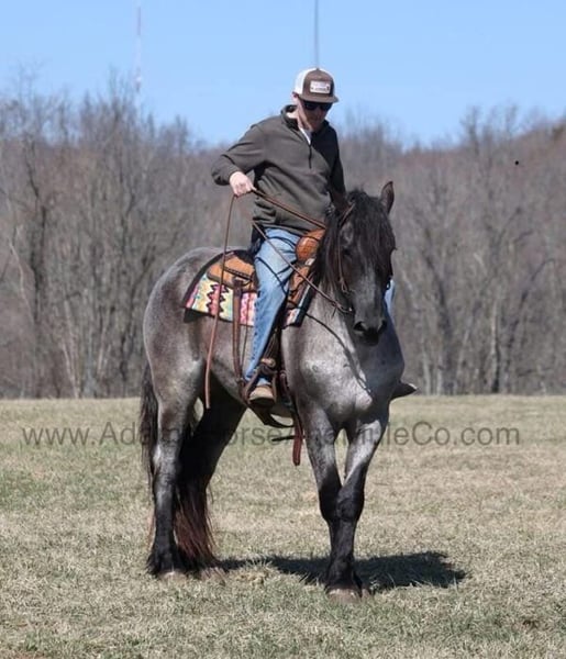Go to visit our website for more pics and a video. AHAMC has been in the horse business and sold horses over the internet since 2005. We have a long track record of success with hundreds of happy customers. We work hard to match riders with the correct horses and specialize in beginner safe, family friendly horses that have been used and checked out by our family! We can set up transportation anywhere in the US and look forward to working with you.Ponch is an awesome looking 16.1h, True Blue Roan Draftcross gelding! He is 5 years old and is a sturdy built horse. Ponch came from the same breeding farm that a lot of our draftcrosses come from and with that farm we find the constant quiet, gentle, laid back temperment that makes them such good family safe trail horses! Ponch is no exception to that statement as he is a super quiet, gentle, laid back type of horse that is going to suit any rider and help build your confidence. Not to mention he is very friendly as well! Ponch can do a variety of things from pulling carriages, to ranch work or trail rides. Ponch has been on camping trips, been ridden in several states and has been ridden by all ages of beginners. When out on the ranch or going down the trails he will cross creeks, ditches, logs and navigate rough rocky areas. He is safe in traffic safe whether that be trucks or cars. He’s been ridden around the ranch, checked cows and rode fences. Ponch moves very smoothly, as he has a nice jog, his lope is smooth as well and he lopes nice circles on a loose rein! Ponch is blue but he will never make you blue and he is sure to be your new best friend! Feel free to call Eric 606-308-2461 with any questions! Go to visit our website for more pics and a video. AHAMC has been in the horse business and sold horses over the internet since 2005. We have a long track record of success with hundreds of happy customers. We work hard to match riders with the correct horses and specialize in beginner safe, family friendly horses that have been used and checked out by our family! We can set up transportation anywhere in the US and look forward to working with you.