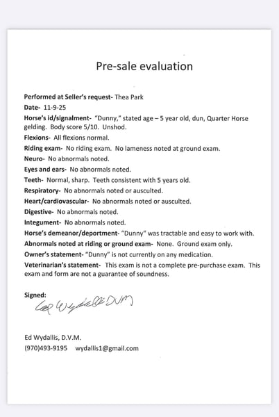 "AVAILABLE ON ONLINE HORSE AUCTION AT www DOT MagicHorseAuction DOT com BIDDING OPEN NOW thru TUESDAY | December 9TH! - BUY IT NOW AVAILABLE! *Final price will be determined on auction site* CONSIGNOR CONTACT INFO: Thea Park 970-632-3644 LOCATION: Fort Collins, CO "★★ DUNNY ★★ Young • Broke • Charming • All-Around Prospect Dunny is a young gelding we had the absolute pleasure of starting ourselves — from groundwork and desensitization to first rides and trailer-outs. This colt has been nothing but willing, reliable, and a total sweetheart to handle. He’s the kind of horse that makes you fall in love with starting colts all over again. Dunny is the first to greet you at the gate, loves his people (and treats), and gets along with every horse in the herd. His happy-go-lucky attitude and puppy-dog personality make him easy to bond with and even easier to train. He’s been hauled all around, and his calm, collected demeanor makes him a standout. We’ve ridden Dunny straight through downtown Fort Collins, leading the group without hesitation — he takes chaos in stride. He’s unfazed by traffic, strollers, bikes, runners, and barking dogs. Out on the trail, he’s surefooted, confident, and steady through long rides and rough terrain. In the arena, Dunny is well ahead for his age. He has a smooth walk, jog, and lope, responds off voice and seat cues, and is developing beautiful collection. He’s showing real promise in lateral work and flexions and has the beginnings of a nice western pleasure and reining foundation. Dunny is also learning groundwork tricks — side-passing to and away from you, spinning, and responding to hand and voice signals. He’s handled tarps, flags, obstacles, and has the brain and try to go in any direction you choose. He leads, loads, ties, bathes, and is great for both the vet and farrier. This gelding is special to us and has been a barn favorite since day one. We’re so proud of his progress and excited to help him find the perfect forever home. 🖤 Watch his video and reach out to meet this lovable colt — Dunny is the real deal.