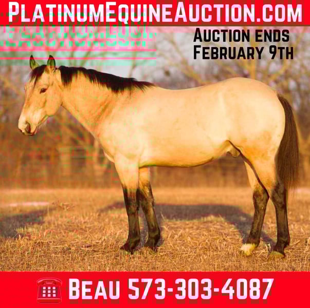 ONLINE AUCTION Place your bids at www.PlatinumEquineAuction.com Starting Bid $3500 Auction ends February 9th, 2025 Need a new saddle? Check out White Rock Saddles on our website or Facebook! Cowboy Royal Sunn is a 2019 Model registered Aqha, Buckskin, gelding that stands 14.1 hands tall and is as wide as he is tall! But don’t let his size fool you he has lots of bone and a big black hard foot. He has been a ranch horse doing anything from doctoring, sorting, moving/loading cattle, riding fence etc…. He has also been trail rode many miles and goes absolutely anywhere you point him without hesitation… nothing bothers this guy from semi trucks, gun fire , fireworks, tractors, cars, dogs ,children running around… he is on his best behavior. He stands to be mounted/dismounted, stands great for farrier, bathes, clips… He is 100% sound and is ready for the next chapter of his life no matter what discipline you want to do I’m sure this guy will shine doing it!!! He is up to date on his vaccinations, coggins, just had his teeth floated, and a fresh set of shoes for any other questions please call or text Broken S Equine Beau 573-303-4087 Located in Sweet Springs, MO. ONLINE AUCTION Place your bids at www.PlatinumEquineAuction.com Starting Bid $3500 Auction ends February 9th, 2025 Need a new saddle? Check out White Rock Saddles on our website or Facebook!