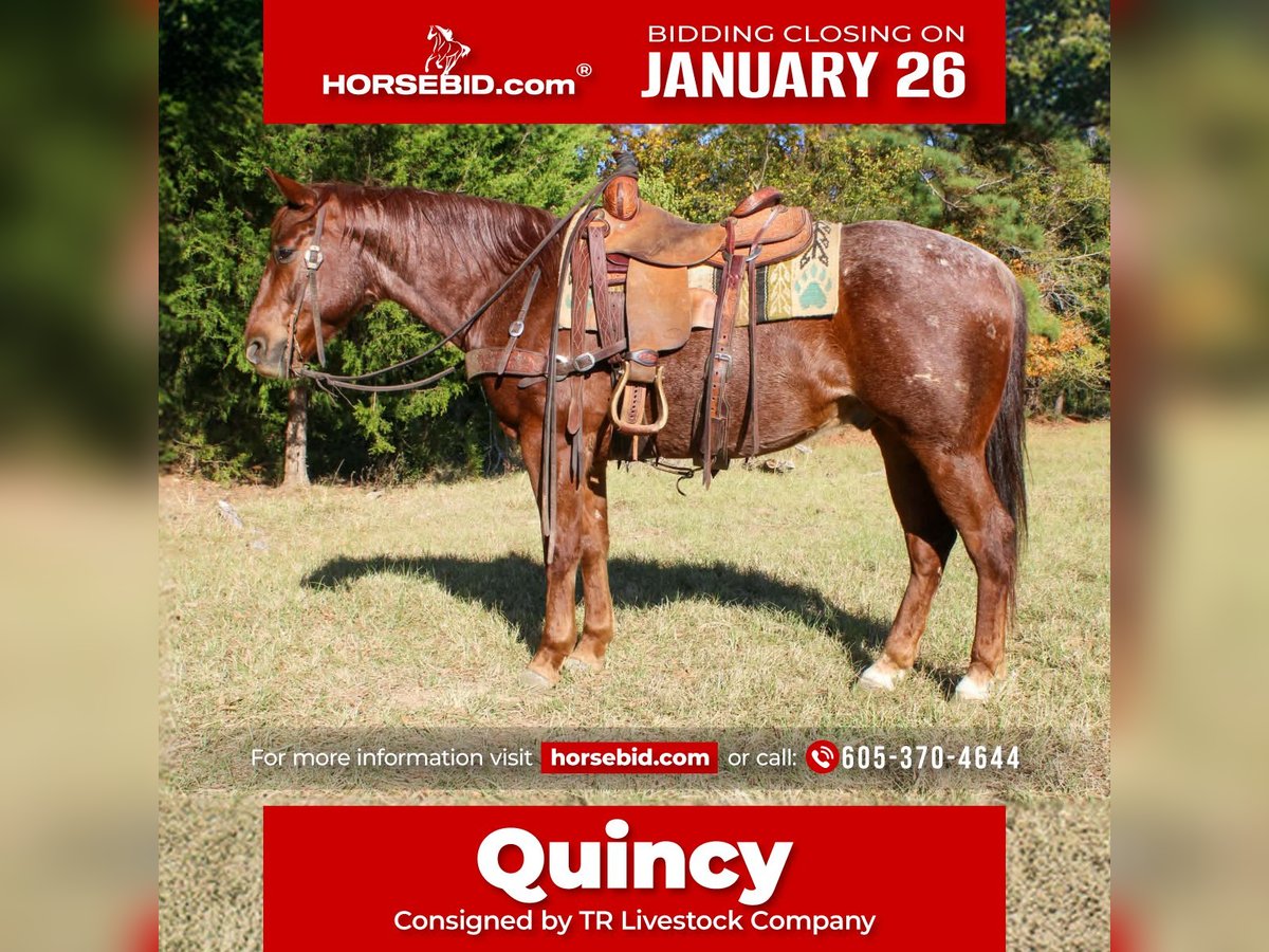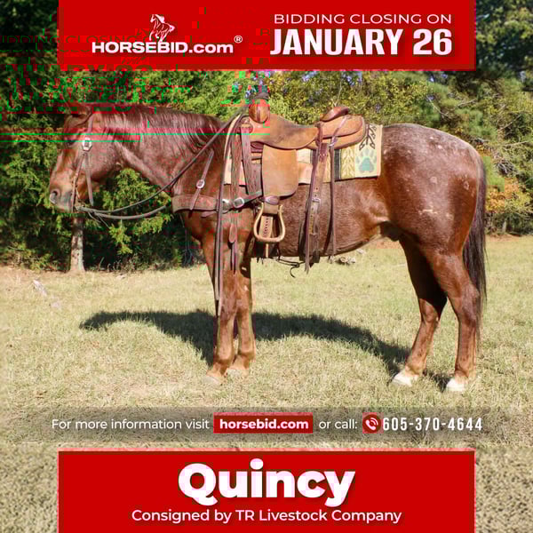 𝐉𝐀𝐍𝐔𝐀𝐑𝐘 ⭐️𝑨𝒍𝒍 𝑺𝒕𝒂𝒓 𝑳𝒊𝒏𝒆𝒖𝒑⭐️ Happening now thru MONDAY | JANUARY 26th - Available EXCLUSIVELY on HorseBid's website! For more details and to register visit: www.Horsebid.com CONSIGNOR CONTACT: TR Livestock Company 605-370-4644 LOCATION: Rusk Texas BREED: AQHA REGISTERED: Yes REGISTERED NAME: Candy wright on COLOR: Red roan HEIGHT: 14.2 AGE: 7 GENDER: Gelding Candy Wright On AKA Quincy is a 7 year old AQHA red roan gelding, standing 14.2 hands tall. He is an own son of NRCHA World Champion Hes Wright On. He has been shown in reined cowhorse as a 5 year old and was year-end Reserve Champion. He is quick footed and fast when asked. Not only has Quincy had a great career in the arena thus far he has also been rode outside a lot! He goes anywhere you point the reins without hesitation, through water, over obstacles, and any type of terrain. In the arena, He has a soft trot and a rocking chair lope. Great transitions and easy cues, makes him so easy to enjoy! He has great spins, pick ups a lope from a stand still, side pass over logs, etc. He could easily go show in the Ranch classes, is suitable for the youth and amateur in the reining cow horse as well! He has always been great with us, whether he had a month or a week off! Back at the barn, he is a favorite, he is a great pasture mate! He stands for the farrier and picks up all 4 feet with ease! He has good ground manners and will stand all day long. Not only is Quincy very broke he is safe! He has been rode by all ages and levels of riders, he is suitable for absolutely anyone. He has great turn arounds and flying changes. Would make a great team sorting or penning horse, continue to show him in the reining cow horse, ranch riding or even the trail classes or just trail ride him and ranch on him! Quincy is sure to make a great addition to anyone’s family! 📍Quincy is located in Rusk Texas. (Nationwide shipping is available!) 🐴PPE’s welcomed at buyers expense! ☎️Please call Rachel with any questions! 605-370-4644