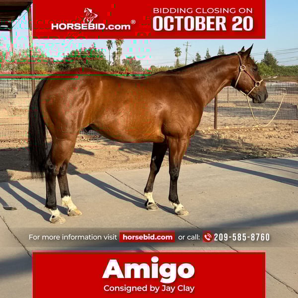 ♦️ 𝐭𝐡𝐞 𝐀𝐌𝐄𝐑𝐈𝐂𝐀𝐍 𝓕𝓪𝓵𝓵 𝓒𝓵𝓪𝓼𝓼𝓲𝓬 ♦️ Happening now thru MONDAY | OCTOBER 20th - Available EXCLUSIVELY on HorseBid's website! For more details and to register visit: www.Horsebid.com CONSIGNOR CONTACT: Jay Clay 209-585-8760 LOCATION: Madera, CA BREED: Quarter horse REGISTERED: No COLOR: Bay HEIGHT: 14.2 AGE: 7 GENDER: Gelding Meet “Amigo” a nice bay 7 year old Ranch- Trail- Heel Gelding! This versatile and athletic horse is the ultimate all-around partner, excelling in trail riding, ranch work, and heeling. Amigo is smooth to ride, kind to all, and an asset to have around! He is a seasoned trail horse, comfortable navigating in all terrain. He's a valuable asset on the ranch, with experience working cattle and handling various tasks with ease. But Amigo is not just limited to trails and ranch work - he's is also a fun jackpot type HEEL horse! Whether you're looking for a partner for competition roping, a reliable trail companion, or a trusty ranch hand, Amigo is the perfect choice. With his intelligent and willing nature, Amigo is easy to use and a pleasure to ride. He's got a strong work ethic and is always eager to please. If you're looking for a horse that can do it all, take a look at Amigo. Sound. UTD on teeth, vaccinations, worming, shoeing, coggins. Call for more information.