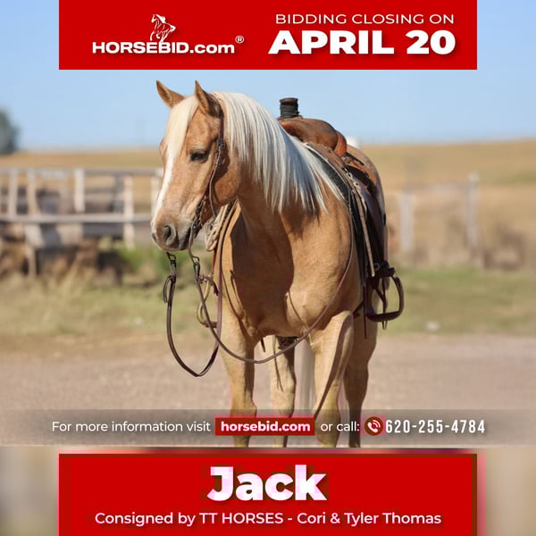 ⚜️𝐭𝐡𝐞 𝓔𝓵𝓲𝓽𝓮 𝐒𝐩𝐫𝐢𝐧𝐠 𝐂𝐥𝐚𝐬𝐬𝐢𝐜⚜️ Happening now thru MONDAY | APRIL 20th - Available EXCLUSIVELY on HorseBid's website! For more details and to register visit: www.Horsebid.com CONSIGNOR CONTACT: TT HORSES - Cori & Tyler Thomas 620-255-4784 LOCATION: Dalhart, TX BREED: Quarter Horse REGISTERED: Yes REGISTERED NAME: WATCHRUSTYJACK 904 COLOR: Palomino HEIGHT: 15 AGE: 7 GENDER: Gelding Jack is an old soul. He is GENTLE. He’s done all aspects of ranch work, rode in the feed yards, drug calves to the fire, roped wheat pasture, been to ranch rodeos, you name it! Lay him off for months, saddle him and lope him off and go to work. He is good to shoe, loves a bath, stands tied, and quiet. Jack is cowy and fun to sort cattle on. We feel he would make a rope horse in no time. For more information please contact Tyler at 620-255-4784