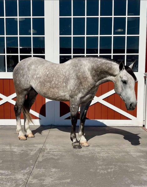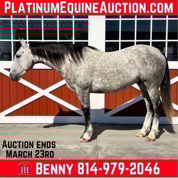 ONLINE AUCTION Place your bids at www.PlatinumEquineAuction.com Starting Bid $3500 Auction ends March 23rd, 2025 Need a new saddle? Check out White Rock Saddles on our website or Facebook! Diego 6 year old dapple grey grade quarter horse gelding that stands 15.1 hands tall and is very stout built. Diego has great ground manners and is easy to handle in the barn and out in the field, good for farrier and stands for vet. He has a true one hand neck rein will turn on his haunches both ways and side pass, nice stop – fluid back up and works off your leg and seat. Diego has been in the feed lots and down the trails and is a great using horse all around. Diego has done some pasture roping and doctoring on cows, he will make someone a nice sorting type as he can push, hold and track cows. He would also fall nicely into the ranch classes as he has all the maneuvers down and rides with the natural head carriage they seek or just have yourself one heck of a nice broke and pretty trail horse. He is clean legged with good feet and no previous medical history, no maintenance and sells sound. All prospective buyers are welcome to have vet checks done at their expense, if you need help I arranging shipping we are happy to share our list of haulers with you. Located in Everett, PA. Contact Benny Hall 814-979-2046 with any questions. ONLINE AUCTION Place your bids at www.PlatinumEquineAuction.com Starting Bid $3500 Auction ends March 23rd, 2025 Need a new saddle? Check out White Rock Saddles on our website or Facebook!