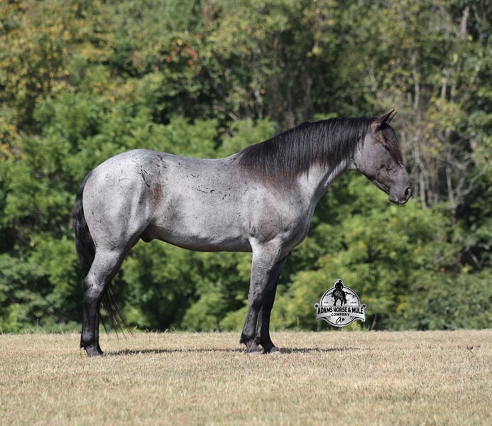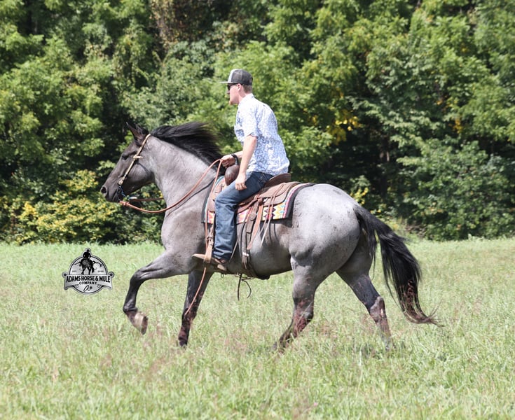 Go to visit our website for more pics and a video www.AdamsHorseAndMuleCo.com AHAMC has been in the horse business and sold horses over the internet since 2005. We have a long track record of success with hundreds of happy customers. We work hard to match riders with the correct horses and specialize in beginner safe, family friendly horses that have been used and checked out by our family! We can set up transportation anywhere in the US and look forward to working with you. Hondo is a rare TRUE BLUE ROAN Draftcross gelding! He is coming 6 years old and is a very stocky built horse. Hondo came from the same breeding farm that a lot of our draftcrosses come from and with that farm we find the constant quiet, gentle, laid back temperament that makes them such good family safe trail horses! Hondo is no exception to that statement as he is a super quiet, gentle, laid back type of horse that is going to suit any rider. Not to mention he is very friendly as well! Hondo can do a variety of things from pulling carriages, to ranch work or trail rides. He has been on camping trips, been ridden in several states and has been ridden by all ages of beginners. When out on the ranch or going down the trails he will cross creeks, ditches, logs and navigate rough rocky areas. He is safe in traffic safe whether that be trucks or cars. He’s been ridden around the ranch, checked cows and rode fences. Hondo moves very smoothly, as he has a nice jog, his lope is smooth as well and he lopes nice circles on a loose rein! Hondo is blue but he will never make you blue and he is sure to be your new best friend! Feel free to call Eric 606-308-2461 with any questions!
