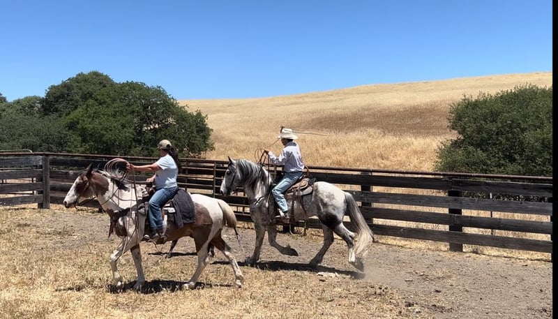 ONLINE AUCTION Place your bids at www.PlatinumEquineAuction.com Starting Bid $3500 Auction ends June 16th, 2024 Need a new saddle? Check out White Rock Saddles on our website or Facebook! Meet Koozie a 5 year old 15.2 hand dapple grey and white draft cross paint gelding. He is absolutely GORGEOUS in every way and such a good boy. He is sweet, personable, and gentle. Koozie stays quiet and easy to handle. Koozie rides western, bareback and English. He can be ridden by any rider of any level. He will walk on a loose rein all day, and move out when asked. Koozie is as comfortable as riding your lazy boy chair at every gait! He will go over small jumps in arena or fallen logs on trails. He is a trail master, will go anywhere he’s pointed. He’ll take you through the deepest water to cool off, into thick woods, or walk you right into town. He is alway on his best behavior and turns every head he passes. They don’t make them any prettier than him. Koozie has been desensitized to the flapping tarp, bouncing ball, And whipping flags! Koozie has also been used out on the ranch to gather and has doctored cattle in the pasture and been to the branding pen. This big boy travels like a horse half his size, he neck reins, collects while backing up, and uses his hind quarters when stopping. He will yield his hindquarters and responds to leg pressure. He catches both his leads effortlessly and lopes pretty perfect circles. Koozie can do rollbacks and lope right off. He has been an absolute joy to have at our ranch he will be greatly missed. Koozie cross ties, clips, bathes and is good for the farrier. He loads up easy and travels well. This gentle giant could go on to do great things. He has the soft, kind eye that makes a great horse. If you want a horse that you will fall in love with, Koozie is your man. Koozie will be the fan favorite everywhere he goes he is just stunning. Located in Paicines, CA. For more info call Longhorn Ranch Dina 831-537-1915. ONLINE AUCTION Place your bids at www.PlatinumEquineAuction.com Starting Bid $3500 Auction ends June 16th, 2024 Need a new saddle? Check out White Rock Saddles on our website or Facebook!