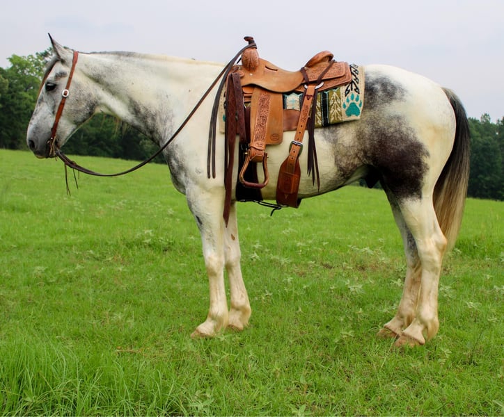 ONLINE AUCTION Place your bids at www.PlatinumEquineAuction.com Starting Bid $3500 Auction ends June 9th, 2024 Need a new saddle? Check out White Rock Saddles on our website or Facebook! Meet Concho, a gentle and affectionate crossbred gelding that will capture hearts wherever he goes! Whether you’re hitting the trails or setting up camp in the hunting grounds, Concho is guaranteed to turn heads. Concho is 8 years old stands at 16.hh and wears a size 4 shoe. He is a absolutely beautiful grey and white paint and has the feathers and bone of a true crossbred! Concho boasts a smooth trot and lope, ensuring a delightful ride all day long. He’s a true gentleman under the saddle, seamlessly opening and closing gates. This solid ranch gelding is versatile, whether you’re dragging calves in the branding pen or embarking on a cattle-doctoring adventure during your next big loop. This surefooted and mild-mannered gelding is not only easy to handle but also makes for the perfect companion on hunting expeditions and pack-in camping trips. He has extensive experience in hunting camps, Concho excels in packing out game and leading a pack-string with ease. Navigating mountains is second nature to Concho, making him an exceptional trail horse. His calm demeanor, sure footing, and easygoing nature make him a joy to ride on any trail. Additionally, Concho shines in the arena, displaying softness, flexibility, and an impressive stop. No matter your equestrian pursuits, Concho is the horse for you. Whether you’re seeking a reliable ranch companion or a stylish performer in the arena, Concho is the epitome of a versatile and well-loved gelding. Don’t miss the chance to bring this exceptional horse into your barn he truly is a favorite that suits riders of all levels! Call or text TR Livestock Rachel 605-370-4644 for more info! Located in Rusk, TX. ONLINE AUCTION Place your bids at www.PlatinumEquineAuction.com Starting Bid $3500 Auction ends June 9th, 2024 Need a new saddle? Check out White Rock Saddles on our website or Facebook!